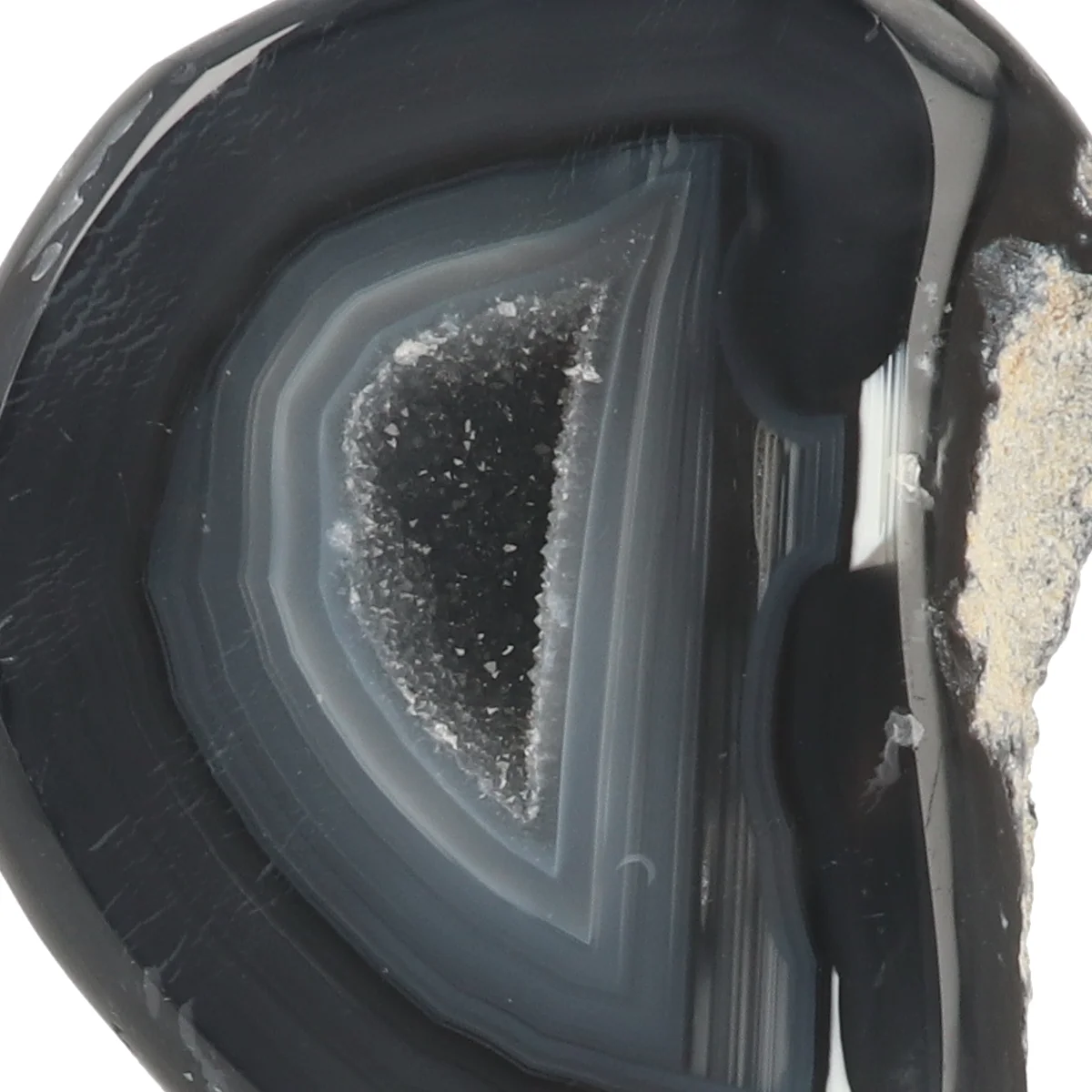 Dieser Achat (Geode) ist in zwei Hälften geschnitten, poliert und auf einen schwarz beschichteten Ständer montiert. Die Gesamthöhe, einschließlich Ständer, variiert zwischen 12 und 15 cm. Der Ständer misst 5 cm mal 7 cm. Bitte beachten Sie, dass kleine Unebenheiten oder Kratzer auf dem schwarzen Ständer nicht immer zu vermeiden sind.
