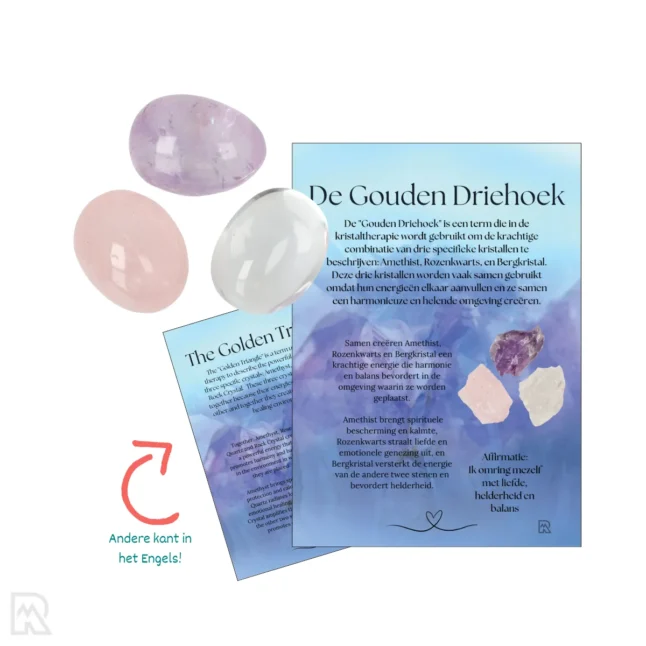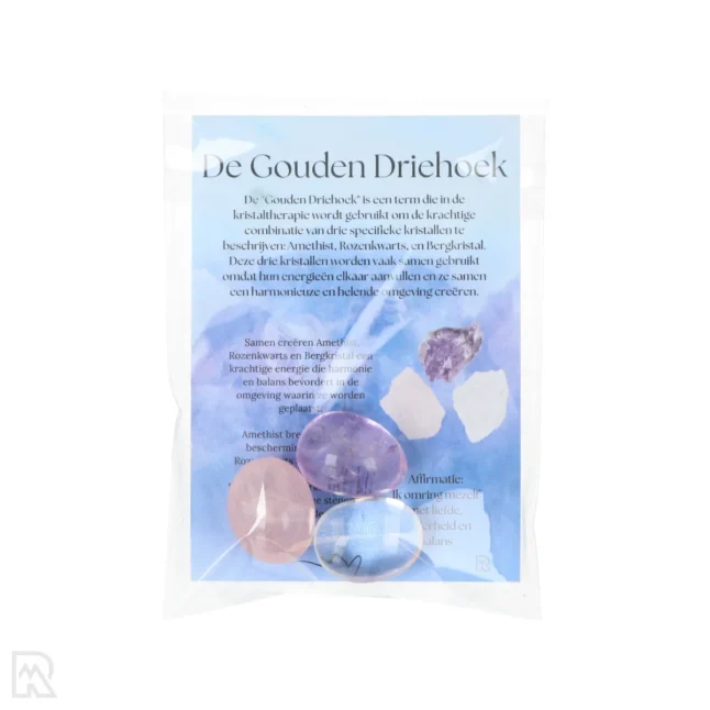 Eine fertige Verkaufstasche mit erklärendem Text über das Goldene Dreieck und einem Amethyst-, Bergkristall- und Rosenquarz-Trommelstein, natürlich in der von uns gewohnten Qualität. Die Trommelsteine sind etwa 2 bis 2,5 cm groß. Die Karte ist in Farbe gedruckt, hat das Format A7 und enthält sowohl niederländischen als auch englischen Text. Das Ganze wird in einer Plastiktüte mit Klebestreifen geliefert, die etwa 9×11 cm groß ist.