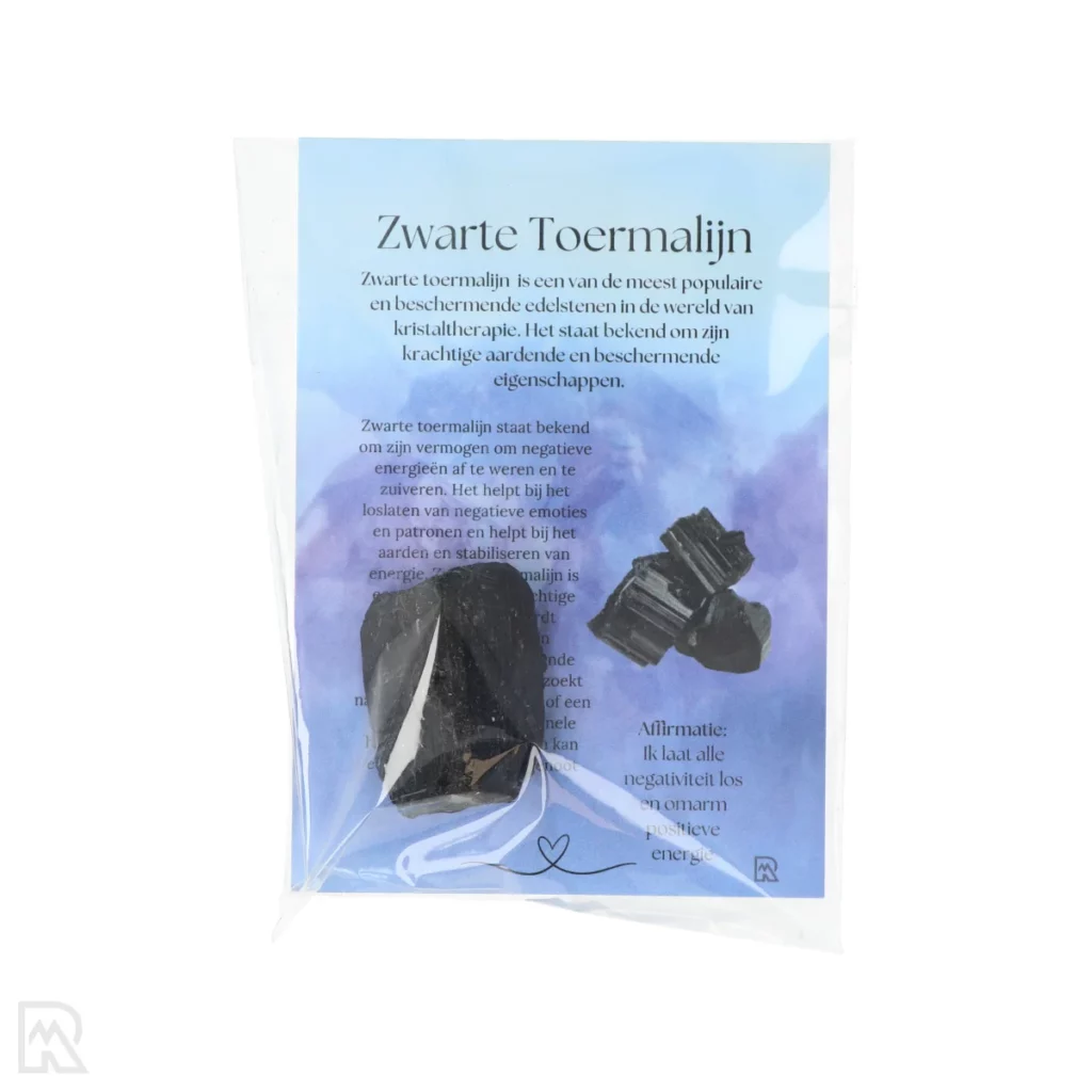 The black tourmaline sales bag is perfect for in shops, but also for web shops. The sales bags consist of a piece of raw black tourmaline and a card listing all the energetic properties of the black tourmaline in Dutch and English.