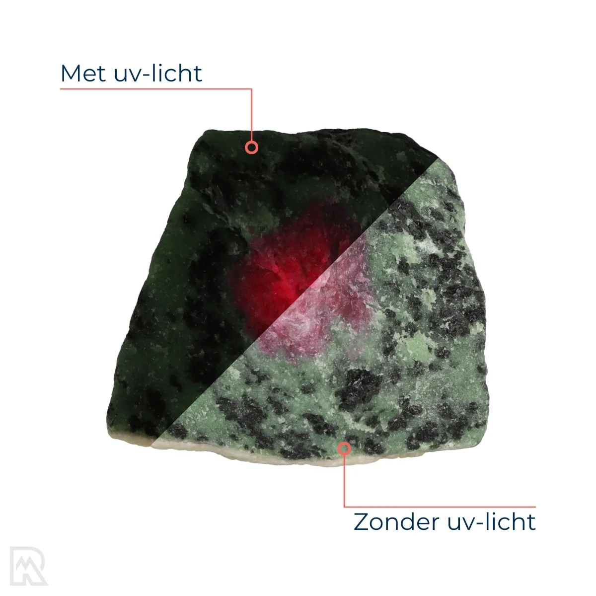Ruby has the special property to fluoresce under UV light. It creates an orange to red glow as shown in the last image. This image serves as an illustration and gives a good idea of what to expect.