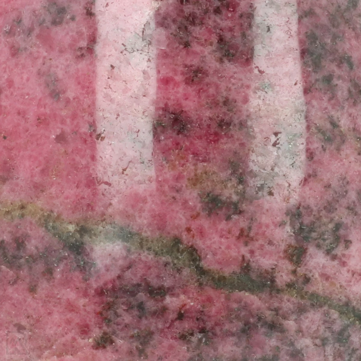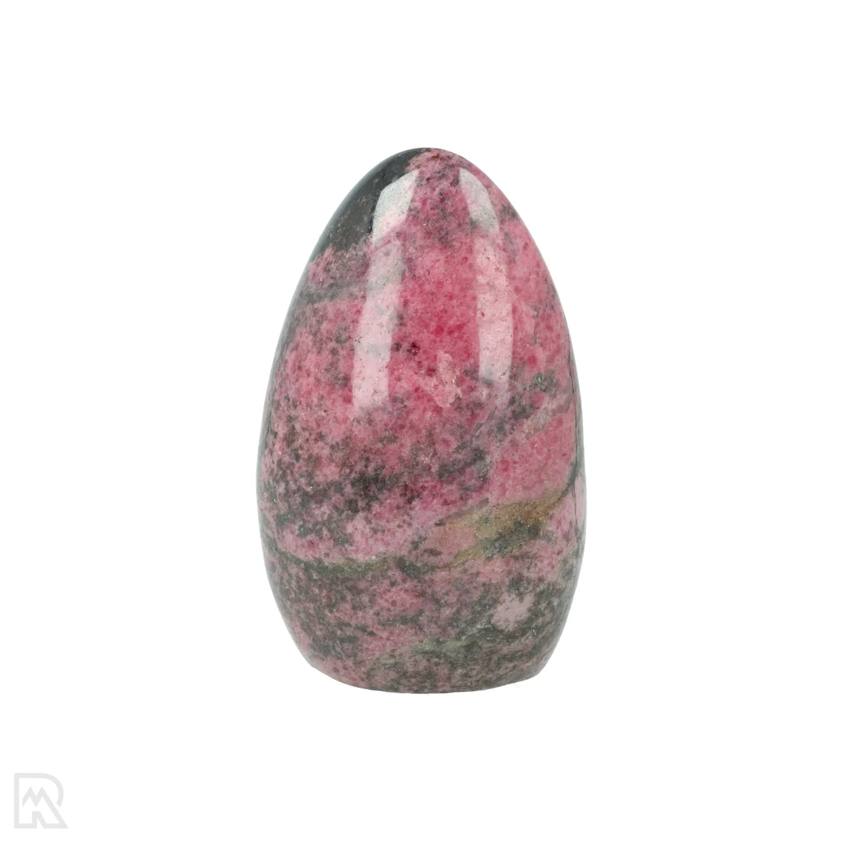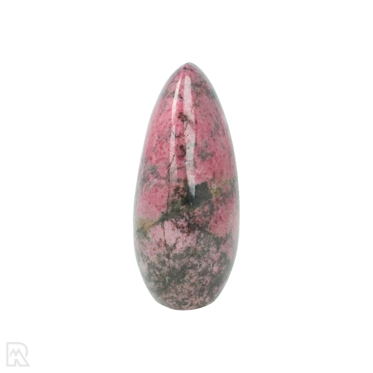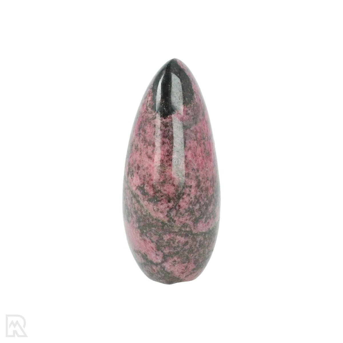Rhodonite is a manganese silicate known for its pink to reddish colour, often with black veins of manganese oxide. The mineral usually forms in metamorphic rocks and is found worldwide. The striking colour combination makes rhodonite popular for decorative applications and jewellery.