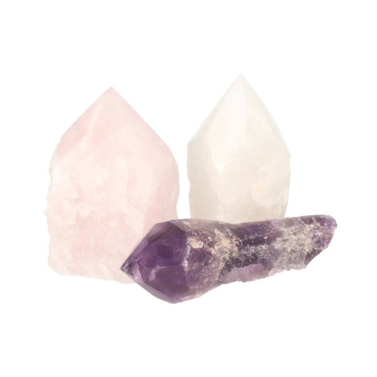 The Bahia amethyst point is about 3 × 10 cm. The rose quartz and rock crystal points are about 5 cm wide and 7-10 cm high.