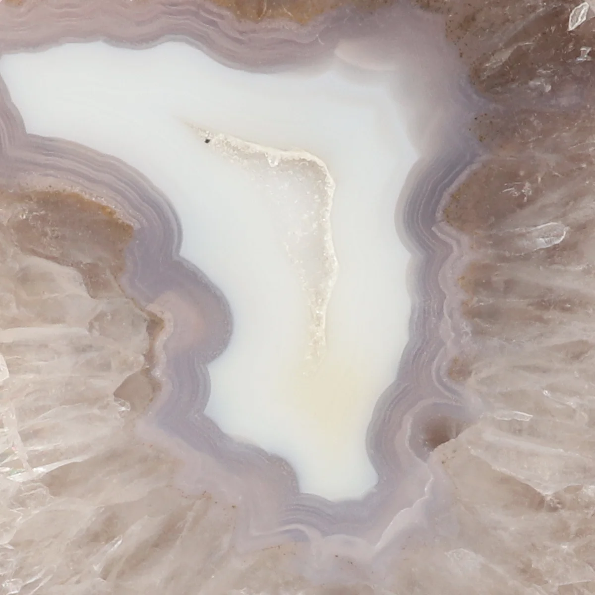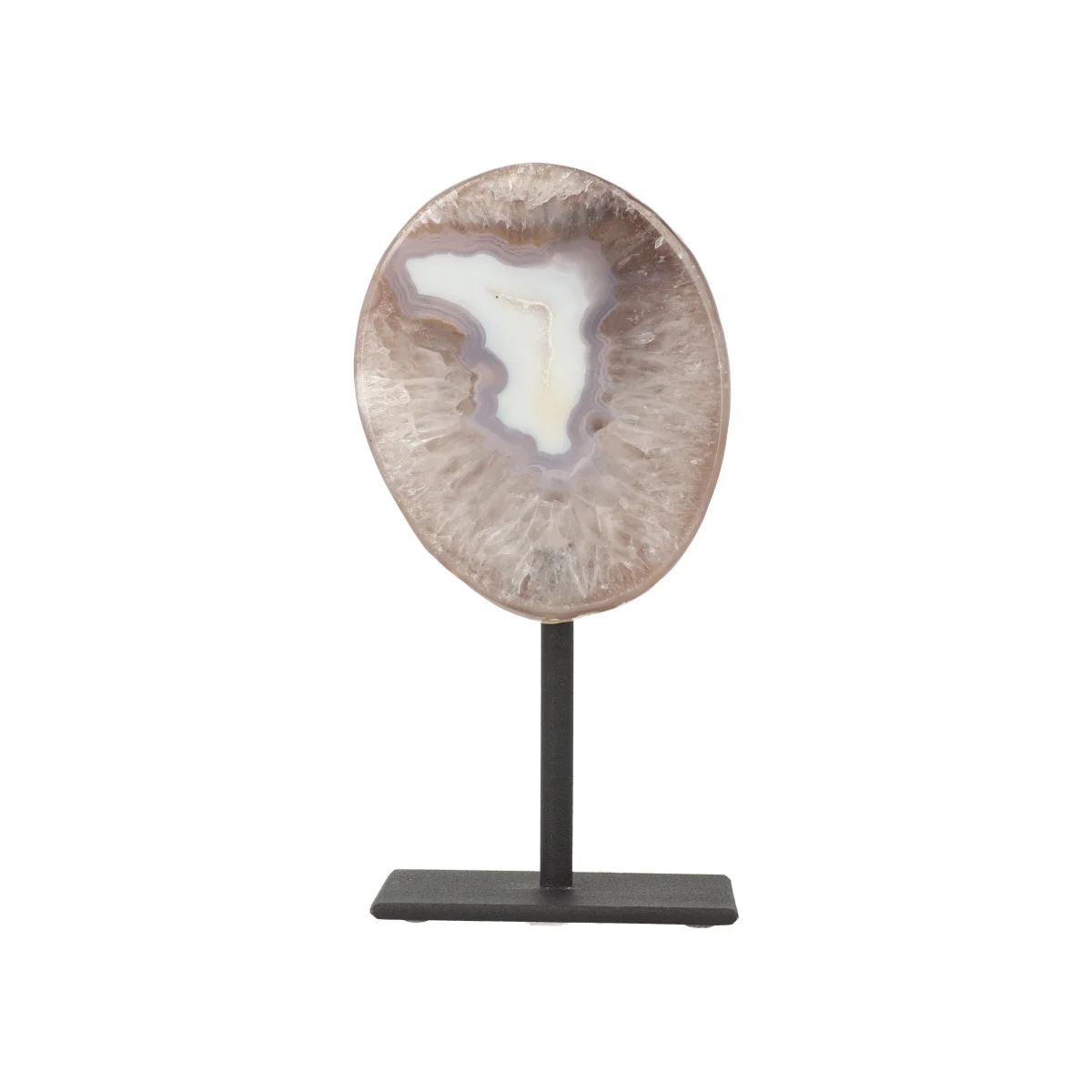A cut Agate (geode), polished and placed on a black coated base/stand. End pieces of a geode are often solid and usually have no opening as with the "Agate Geode on Stand". The height at size S ranges from 12 to 15 cm, including stand. The stand itself is 5 by 7 cm. Please note that small imperfections on the black stand and/or scratches on it cannot (always) be avoided.