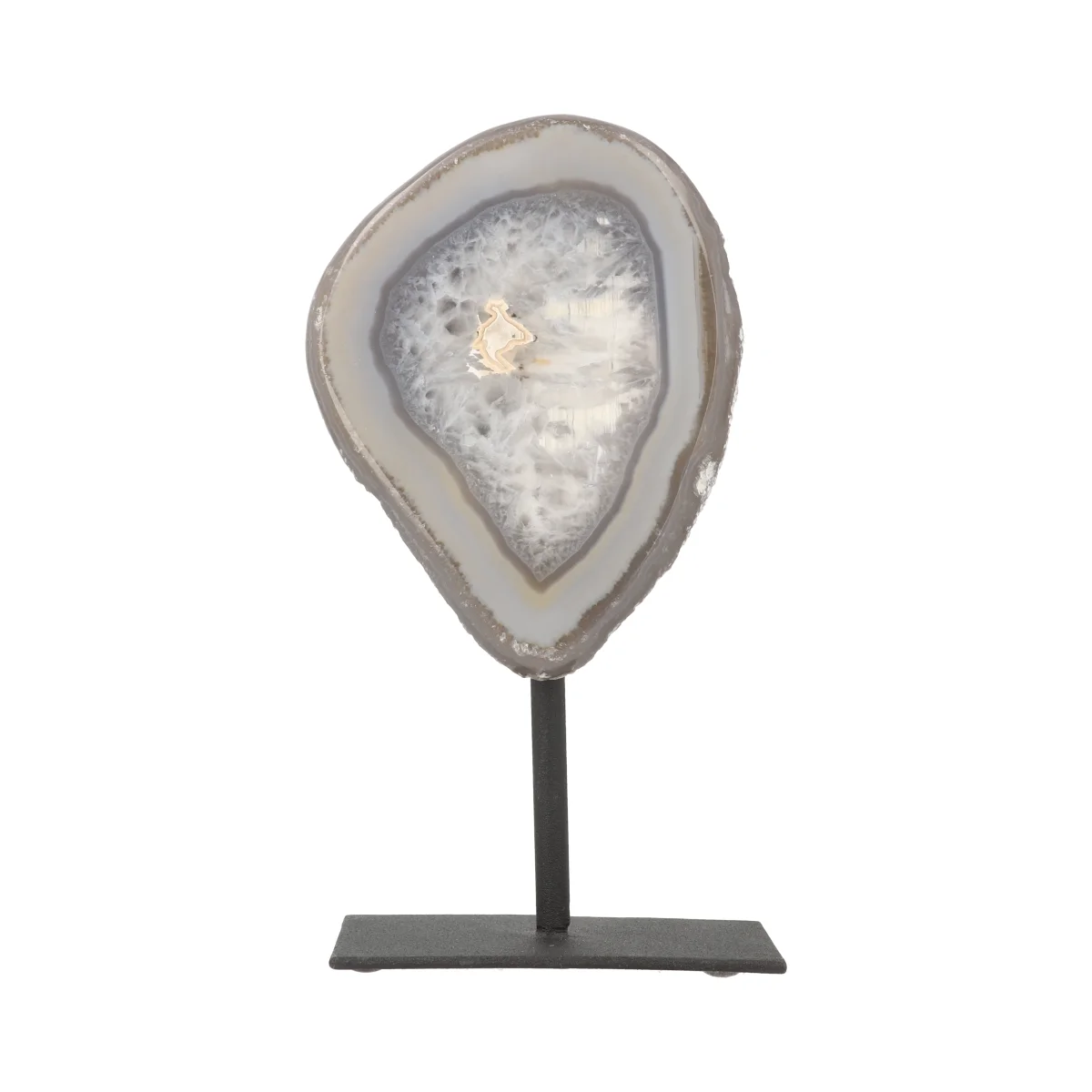 An Agate Geode usually has an opening with visible crystal formation. An Agate End (the end piece of a geode) is usually solid and has no opening, but may very occasionally contain slight crystal formation. The Agate on Standard is completely solid and therefore generally looks more monotonous than an Agate End.