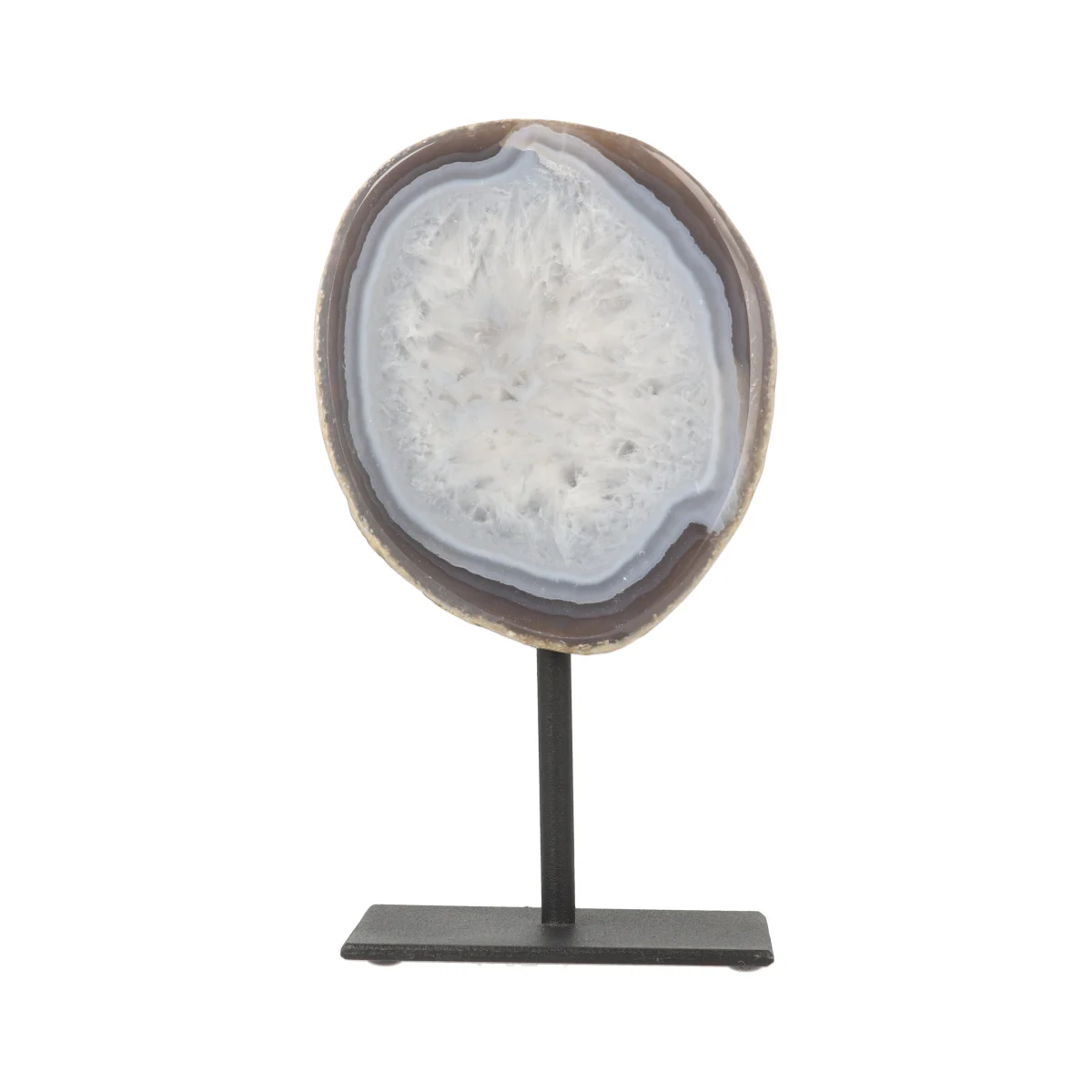 This Agate has been cut, polished and placed on a black coated stand. We have three variants in our range: Agate Geode on Standard, Agate End on Stand and Agate on Standard.
