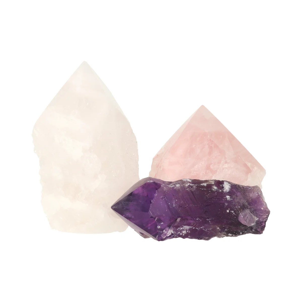 The Bahia amethyst point is about 3 Ɨ 10 cm. The rose quartz and rock crystal points are about 5 cm wide and 7-10 cm high.