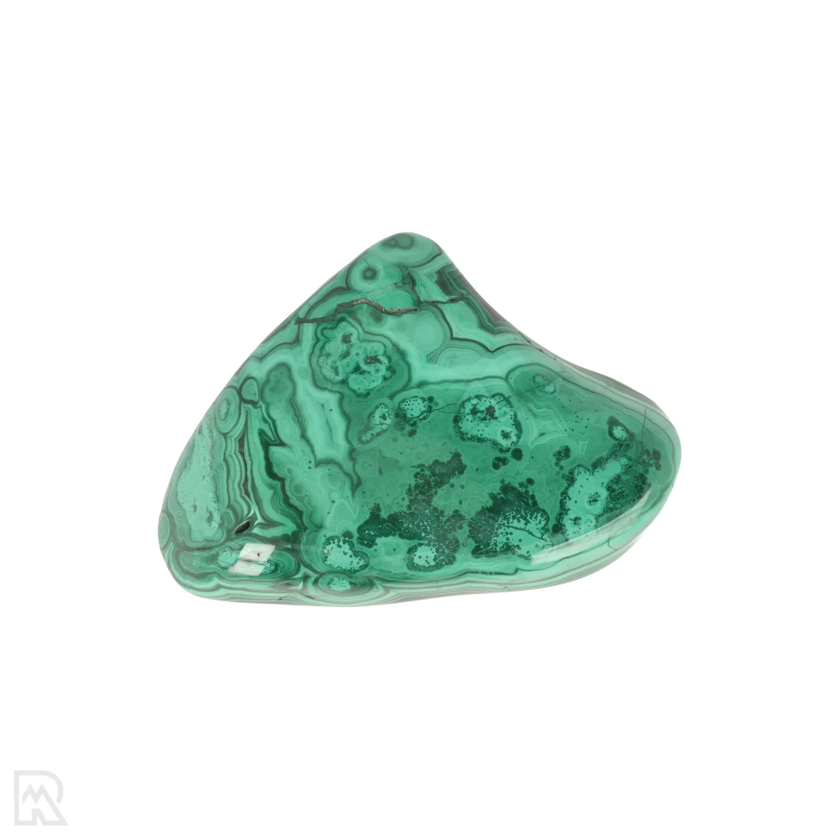 Malachite is an intense green copper-bearing mineral notable for its characteristic band patterns and glass to silky luster. The colour ranges from light green to dark green, often with concentric or layered drawings. The mineral usually forms in the oxidation zones of copper deposits.
