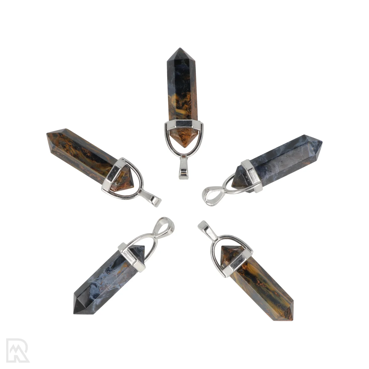 De tot dubbeleinder geslepen steen is bevestigd in een zilver- of goudkleurige houder met oog. De dubbeleinder heeft een lengte van circa 3,2 cm, gemeten zonder het oog. Deze hangers zijn beschikbaar in verschillende steensoorten en worden per stuk geleverd. Door het gebruik van natuursteen kunnen kleur, tekening en afwerking per hanger onderling licht verschillen.