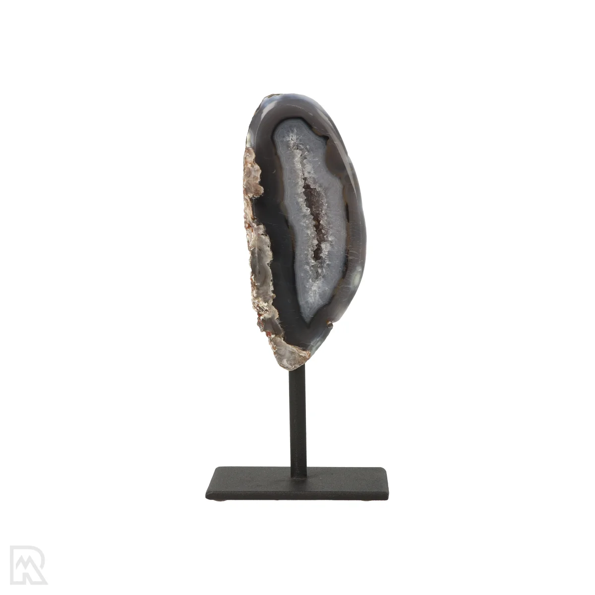 Deze Agaat (geode) is doormidden gezaagd, gepolijst en gemonteerd op een zwart gecoate standaard. De totale hoogte, inclusief standaard, varieert tussen de 12 en 15 cm. De standaard heeft een formaat van 5 bij 7 cm. Houd er rekening mee dat kleine imperfecties of krasjes op de zwarte standaard niet altijd te vermijden zijn.
