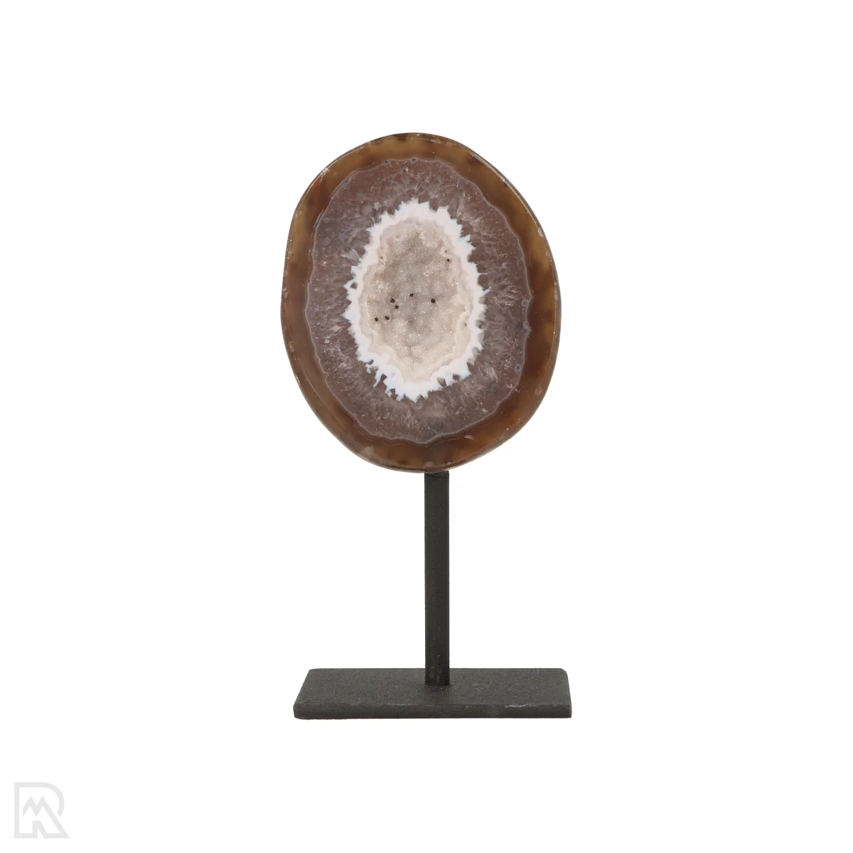 Deze Agaat (geode) is doormidden gezaagd, gepolijst en gemonteerd op een zwart gecoate standaard. De totale hoogte, inclusief standaard, varieert tussen de 12 en 15 cm. De standaard heeft een formaat van 5 bij 7 cm. Houd er rekening mee dat kleine imperfecties of krasjes op de zwarte standaard niet altijd te vermijden zijn.