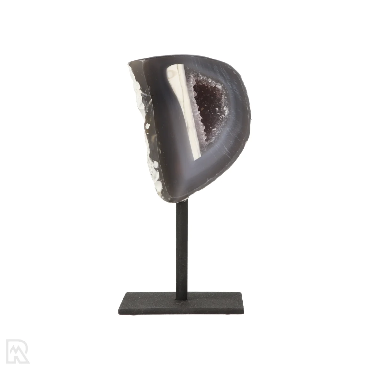 Deze Agaat (geode) is doormidden gezaagd, gepolijst en gemonteerd op een zwart gecoate standaard. De totale hoogte, inclusief standaard, varieert tussen de 12 en 15 cm. De standaard heeft een formaat van 5 bij 7 cm. Houd er rekening mee dat kleine imperfecties of krasjes op de zwarte standaard niet altijd te vermijden zijn.