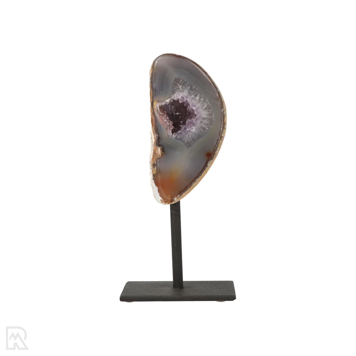 Deze Agaat (geode) is doormidden gezaagd, gepolijst en gemonteerd op een zwart gecoate standaard. De totale hoogte, inclusief standaard, varieert tussen de 12 en 15 cm. De standaard heeft een formaat van 5 bij 7 cm. Houd er rekening mee dat kleine imperfecties of krasjes op de zwarte standaard niet altijd te vermijden zijn.