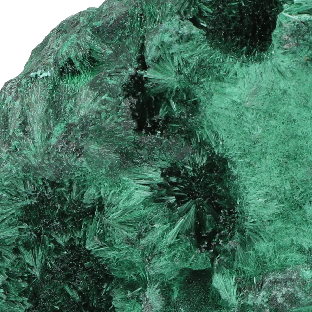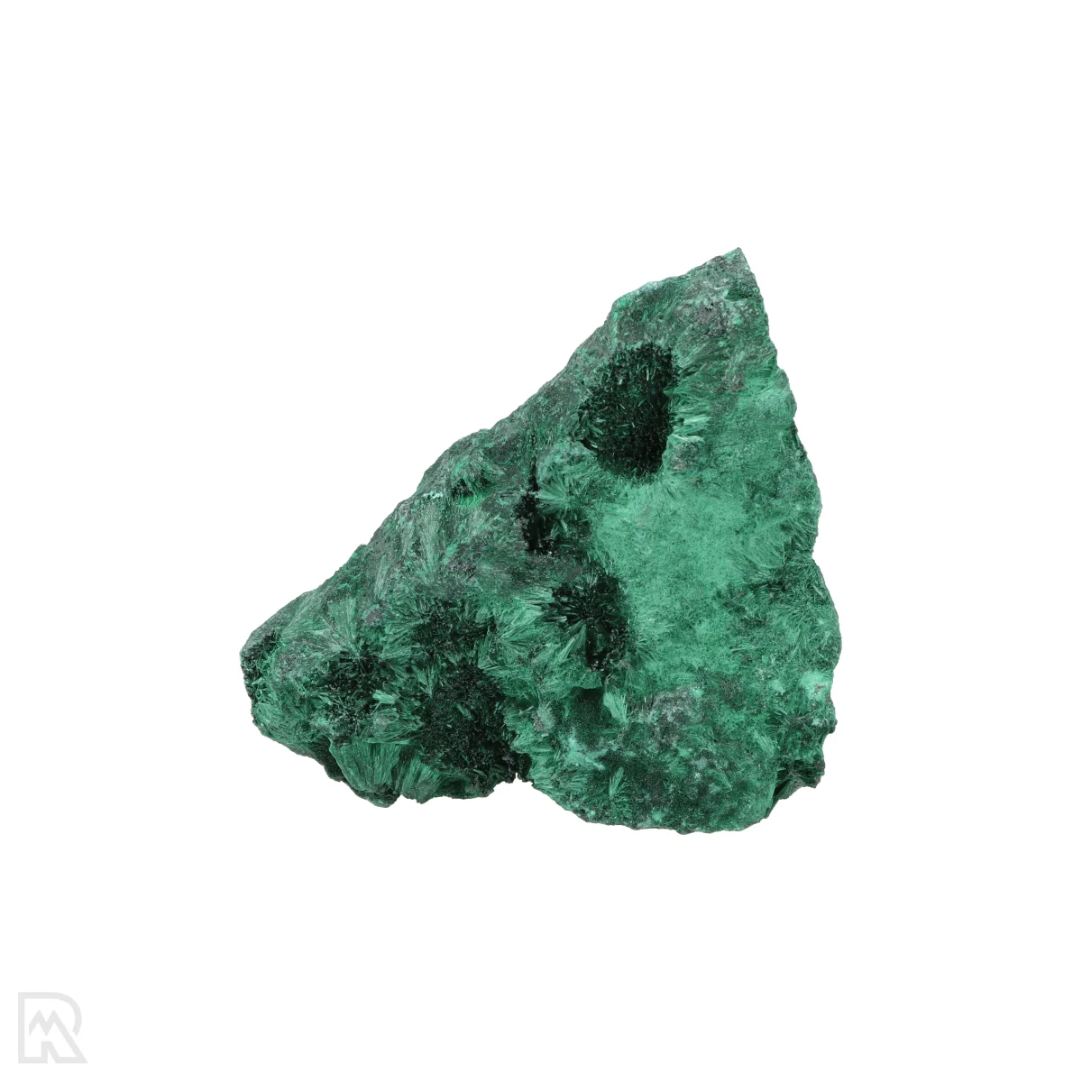 Malachiet is een intens groen koperhoudend mineraal dat opvalt door zijn karakteristieke bandpatronen en glas- tot zijdeachtige glans. De kleur varieert van lichtgroen tot donkergroen, vaak met concentrische of gelaagde tekeningen. Het mineraal vormt zich meestal in de oxidatiezones van koperafzettingen.