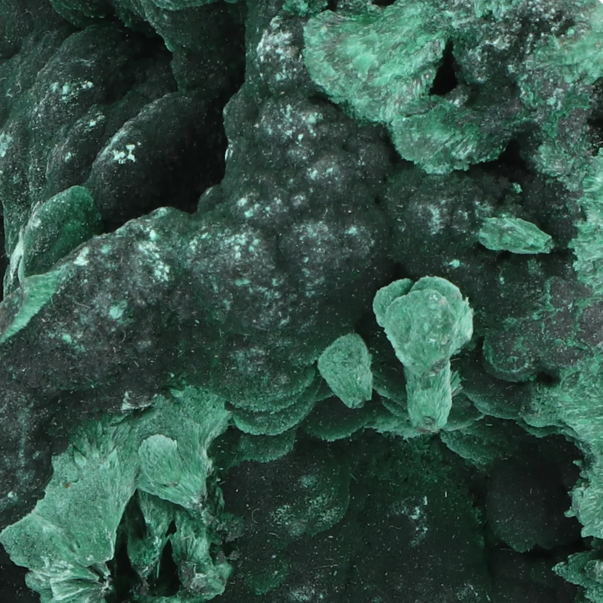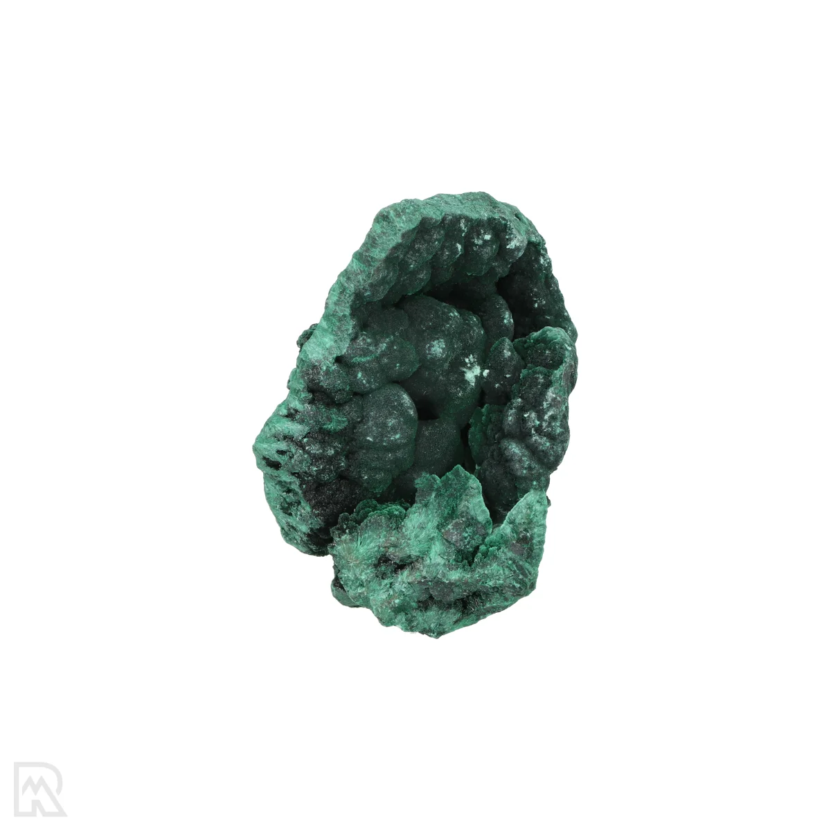 Malachiet is een intens groen koperhoudend mineraal dat opvalt door zijn karakteristieke bandpatronen en glas- tot zijdeachtige glans. De kleur varieert van lichtgroen tot donkergroen, vaak met concentrische of gelaagde tekeningen. Het mineraal vormt zich meestal in de oxidatiezones van koperafzettingen.