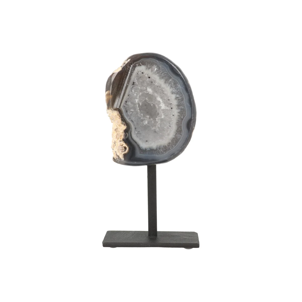 Deze Agaat (geode) is doormidden gezaagd, gepolijst en gemonteerd op een zwart gecoate standaard. De totale hoogte, inclusief standaard, varieert tussen de 12 en 15 cm. De standaard heeft een formaat van 5 bij 7 cm. Houd er rekening mee dat kleine imperfecties of krasjes op de zwarte standaard niet altijd te vermijden zijn.