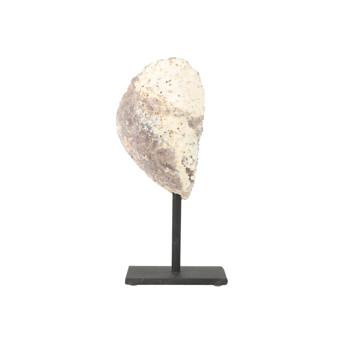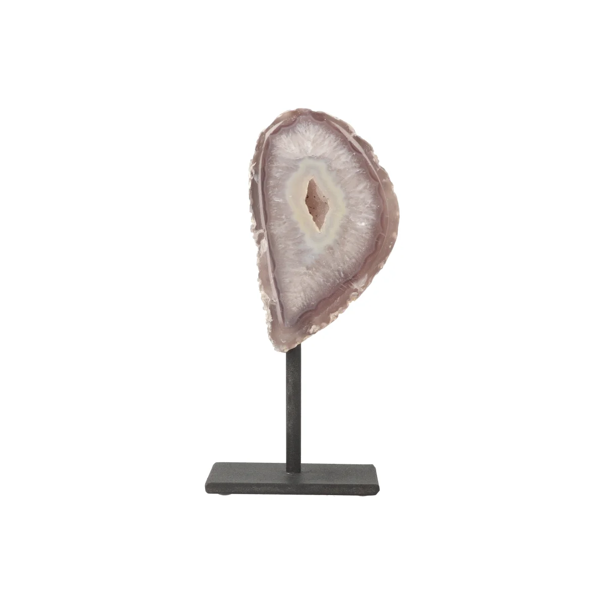 Deze Agaat (geode) is doormidden gezaagd, gepolijst en gemonteerd op een zwart gecoate standaard. De totale hoogte, inclusief standaard, varieert tussen de 12 en 15 cm. De standaard heeft een formaat van 5 bij 7 cm. Houd er rekening mee dat kleine imperfecties of krasjes op de zwarte standaard niet altijd te vermijden zijn.
