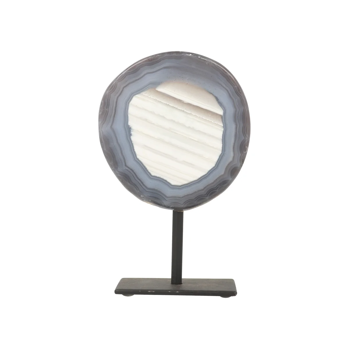 Een doorgezaagde Agaat (geode), gepolijst en op een zwarte gecoate voet/standaard geplaatst. Eind stukken van een geode zijn vaak massief en hebben meestal geen opening zoals bij de “Agaat Geode op Standaard”. De hoogte bij maat S varieert van 12 tot 15 cm, inclusief standaard. De standaard zelf is 5 bij 7 cm. Let erop dat kleine imperfecties aan de zwarte standaard en/of krasjes hierop niet (altijd) zijn te voorkomen.