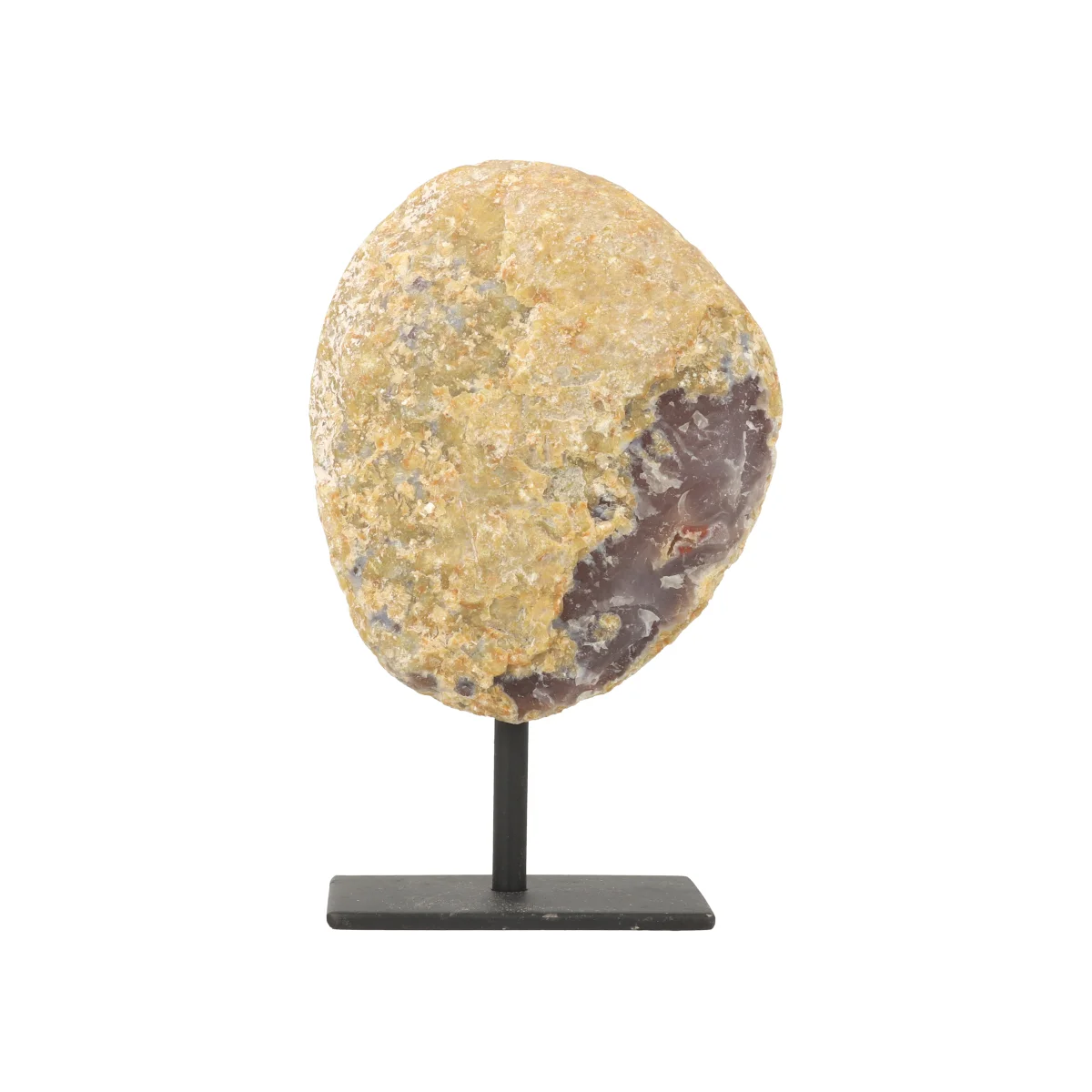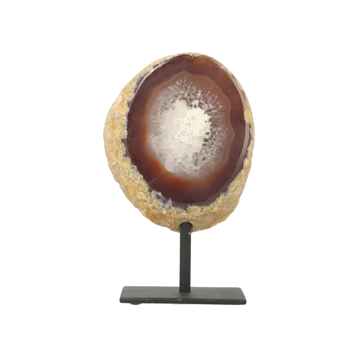 Een doorgezaagde Agaat (geode), gepolijst en op een zwarte gecoate voet/standaard geplaatst. Eind stukken van een geode zijn vaak massief en hebben meestal geen opening zoals bij de “Agaat Geode op Standaard”. De hoogte bij maat S varieert van 12 tot 15 cm, inclusief standaard. De standaard zelf is 5 bij 7 cm. Let erop dat kleine imperfecties aan de zwarte standaard en/of krasjes hierop niet (altijd) zijn te voorkomen.