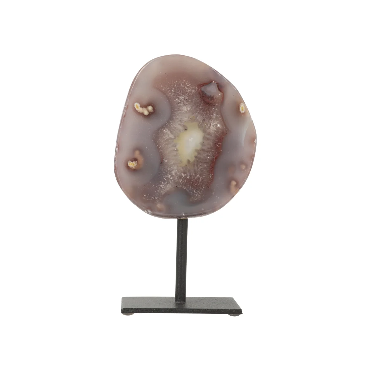 Een doorgezaagde Agaat (geode), gepolijst en op een zwarte gecoate voet/standaard geplaatst. Eind stukken van een geode zijn vaak massief en hebben meestal geen opening zoals bij de “Agaat Geode op Standaard”. De hoogte bij maat S varieert van 12 tot 15 cm, inclusief standaard. De standaard zelf is 5 bij 7 cm. Let erop dat kleine imperfecties aan de zwarte standaard en/of krasjes hierop niet (altijd) zijn te voorkomen.