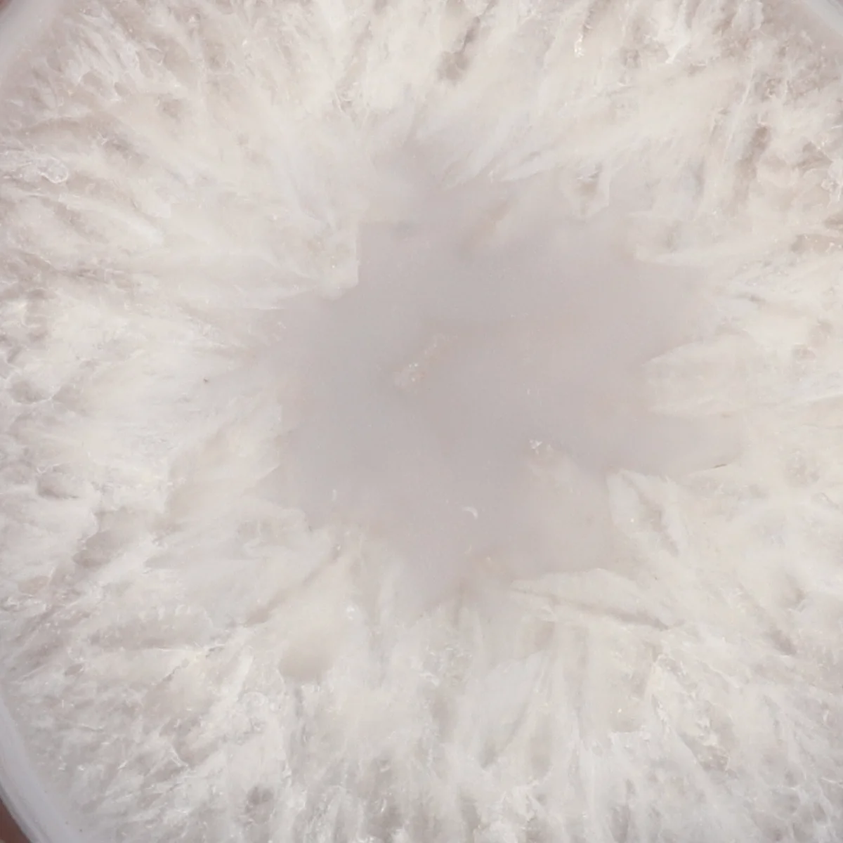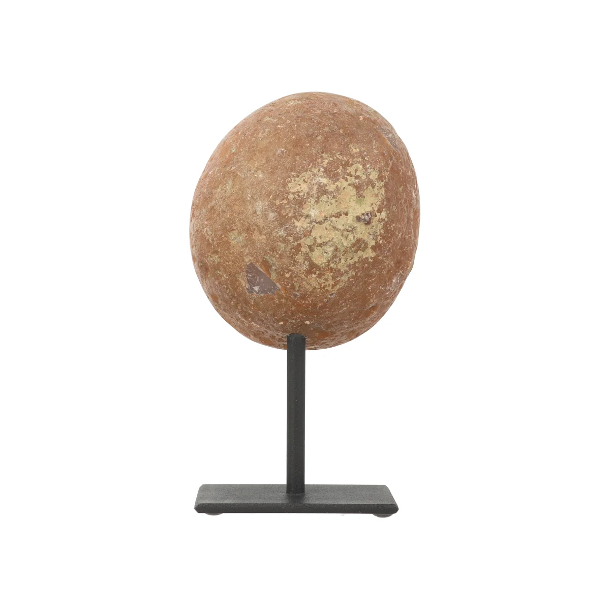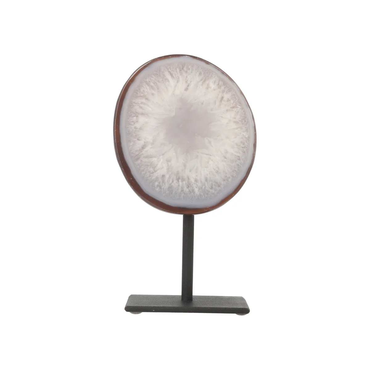 Een doorgezaagde Agaat (geode), gepolijst en op een zwarte gecoate voet/standaard geplaatst. Eind stukken van een geode zijn vaak massief en hebben meestal geen opening zoals bij de “Agaat Geode op Standaard”. De hoogte bij maat S varieert van 12 tot 15 cm, inclusief standaard. De standaard zelf is 5 bij 7 cm. Let erop dat kleine imperfecties aan de zwarte standaard en/of krasjes hierop niet (altijd) zijn te voorkomen.