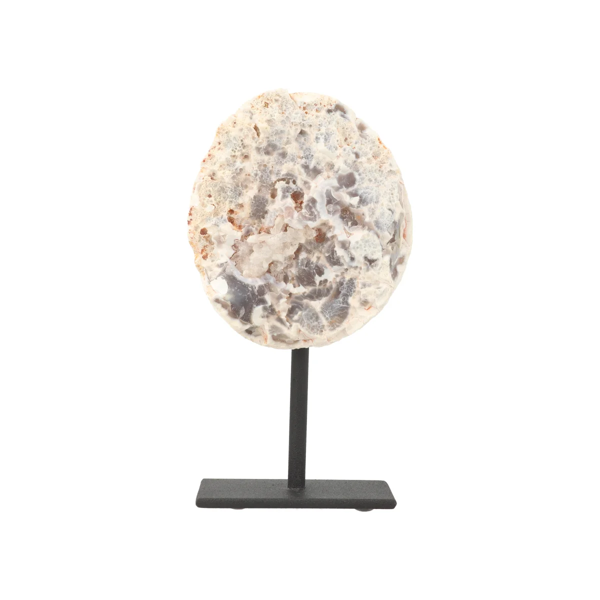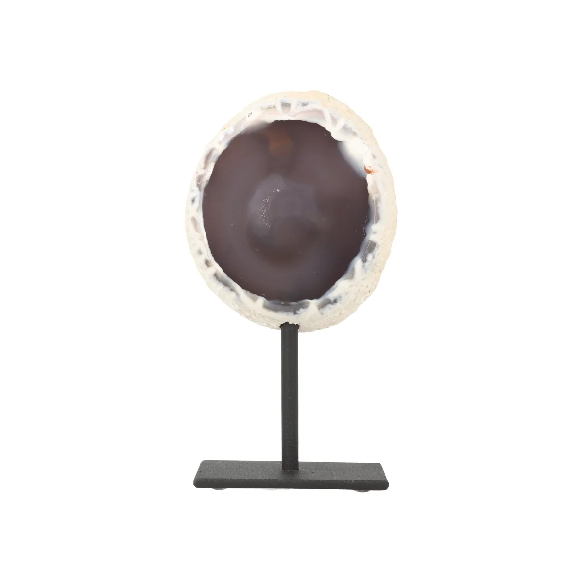 Een doorgezaagde Agaat (geode), gepolijst en op een zwarte gecoate voet/standaard geplaatst. Eind stukken van een geode zijn vaak massief en hebben meestal geen opening zoals bij de “Agaat Geode op Standaard”. De hoogte bij maat S varieert van 12 tot 15 cm, inclusief standaard. De standaard zelf is 5 bij 7 cm. Let erop dat kleine imperfecties aan de zwarte standaard en/of krasjes hierop niet (altijd) zijn te voorkomen.