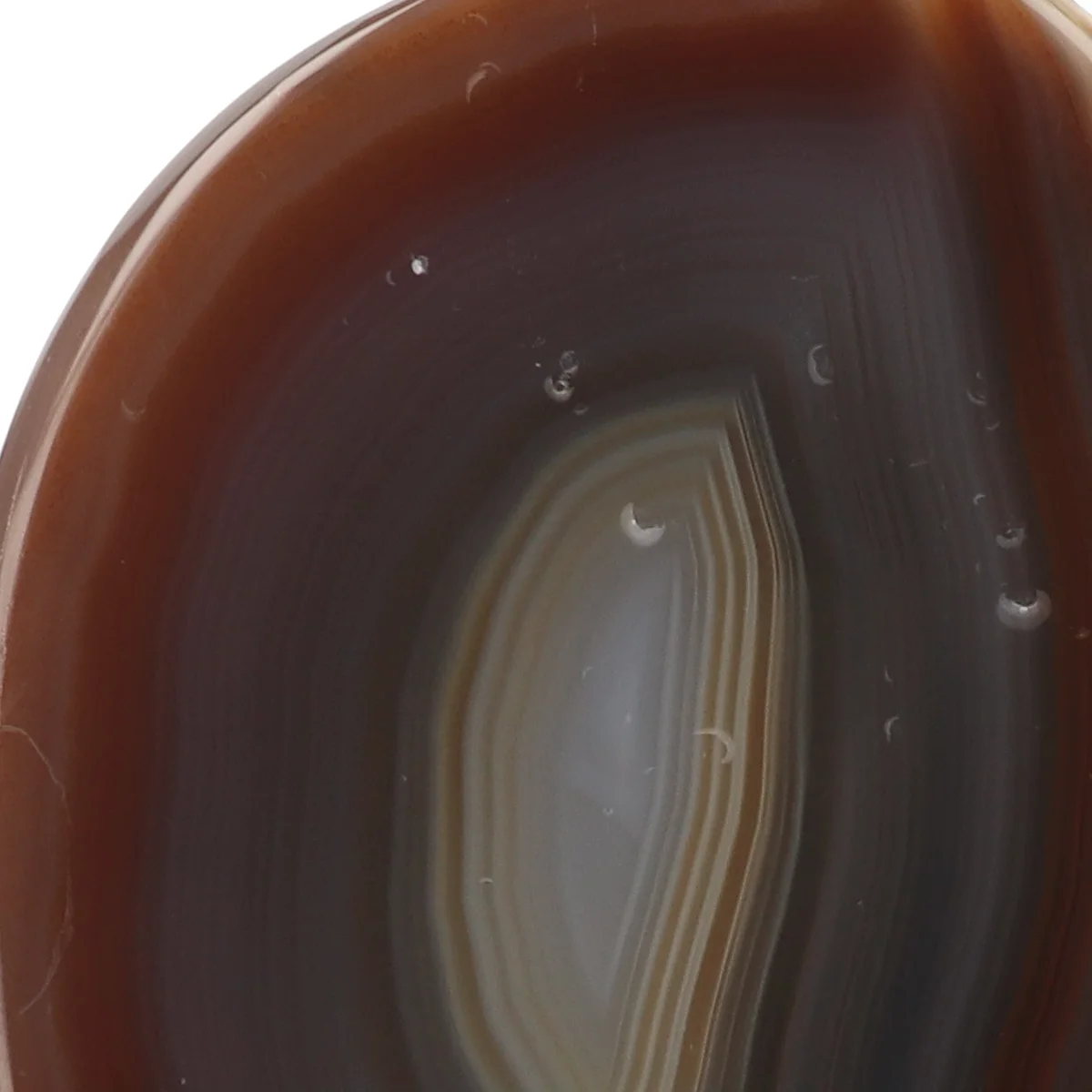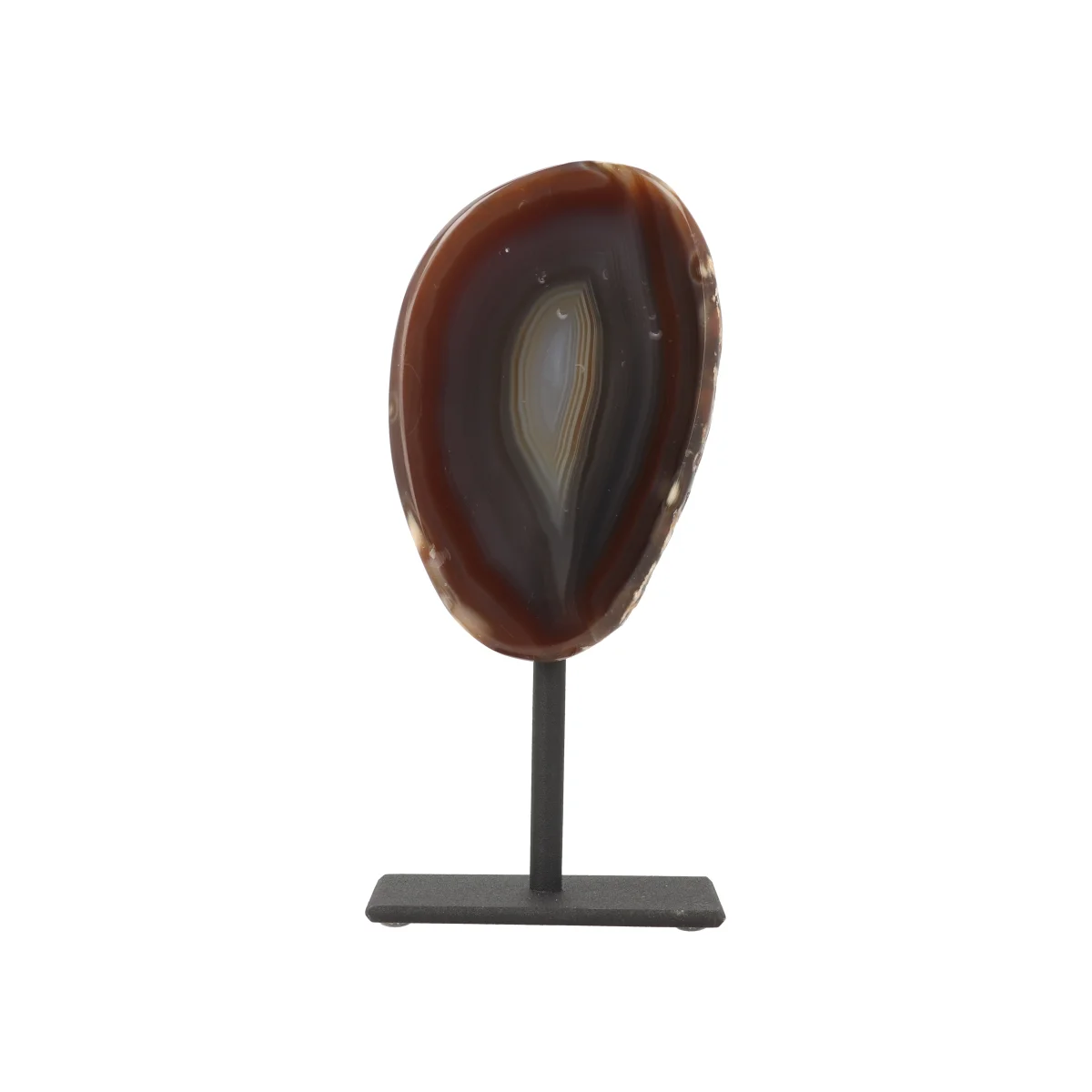 Een doorgezaagde Agaat (geode), gepolijst en op een zwarte gecoate voet/standaard geplaatst. Eind stukken van een geode zijn vaak massief en hebben meestal geen opening zoals bij de “Agaat Geode op Standaard”. De hoogte bij maat S varieert van 12 tot 15 cm, inclusief standaard. De standaard zelf is 5 bij 7 cm. Let erop dat kleine imperfecties aan de zwarte standaard en/of krasjes hierop niet (altijd) zijn te voorkomen.