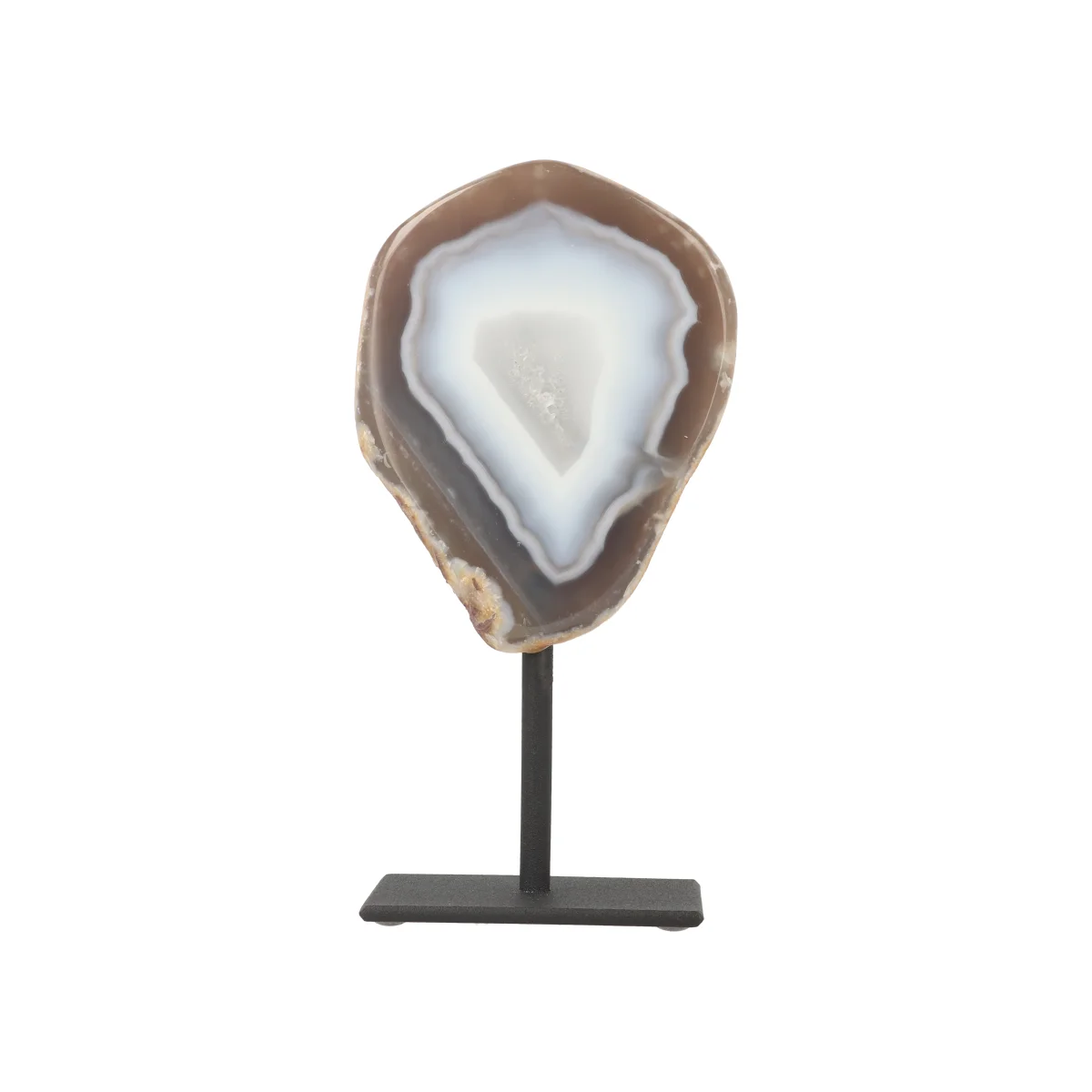 Een doorgezaagde Agaat (geode), gepolijst en op een zwarte gecoate voet/standaard geplaatst. Eind stukken van een geode zijn vaak massief en hebben meestal geen opening zoals bij de “Agaat Geode op Standaard”. De hoogte bij maat S varieert van 12 tot 15 cm, inclusief standaard. De standaard zelf is 5 bij 7 cm. Let erop dat kleine imperfecties aan de zwarte standaard en/of krasjes hierop niet (altijd) zijn te voorkomen.