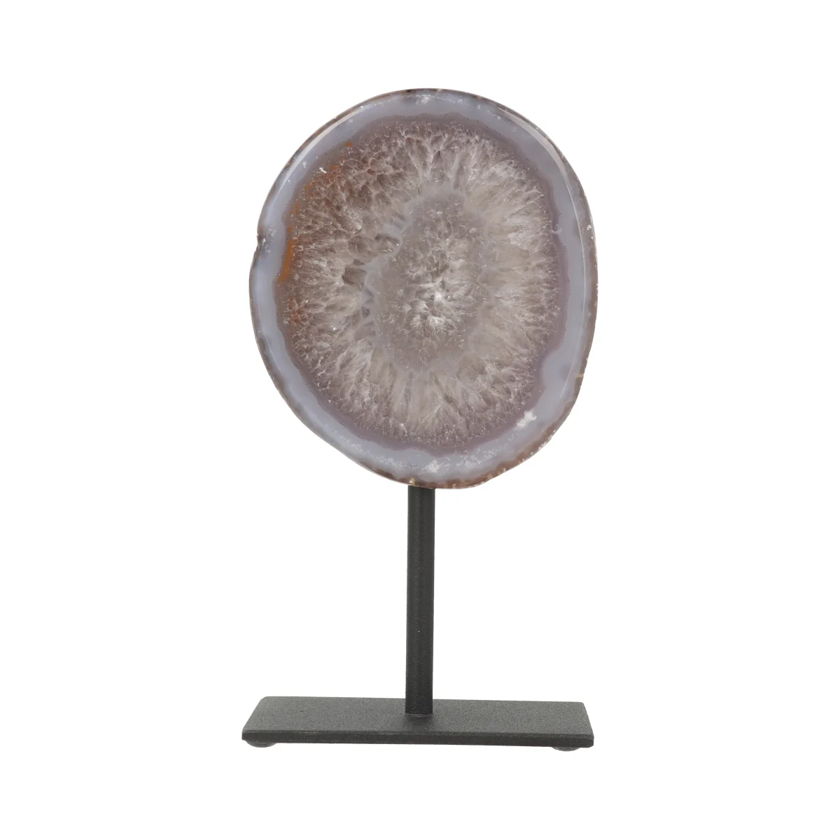 Deze Agaat is doorgezaagd, gepolijst en geplaatst op een zwarte gecoate standaard. Wij hebben drie varianten in ons assortiment: Agaat Geode op Standaard, Agaat Eind op Standaard en Agaat op Standaard.