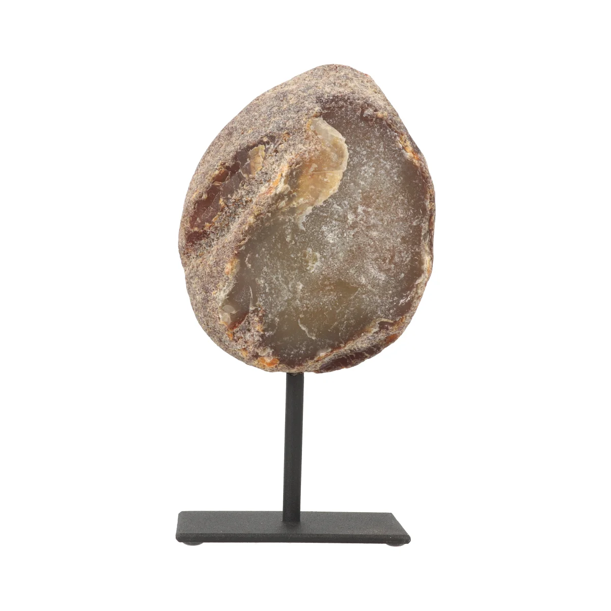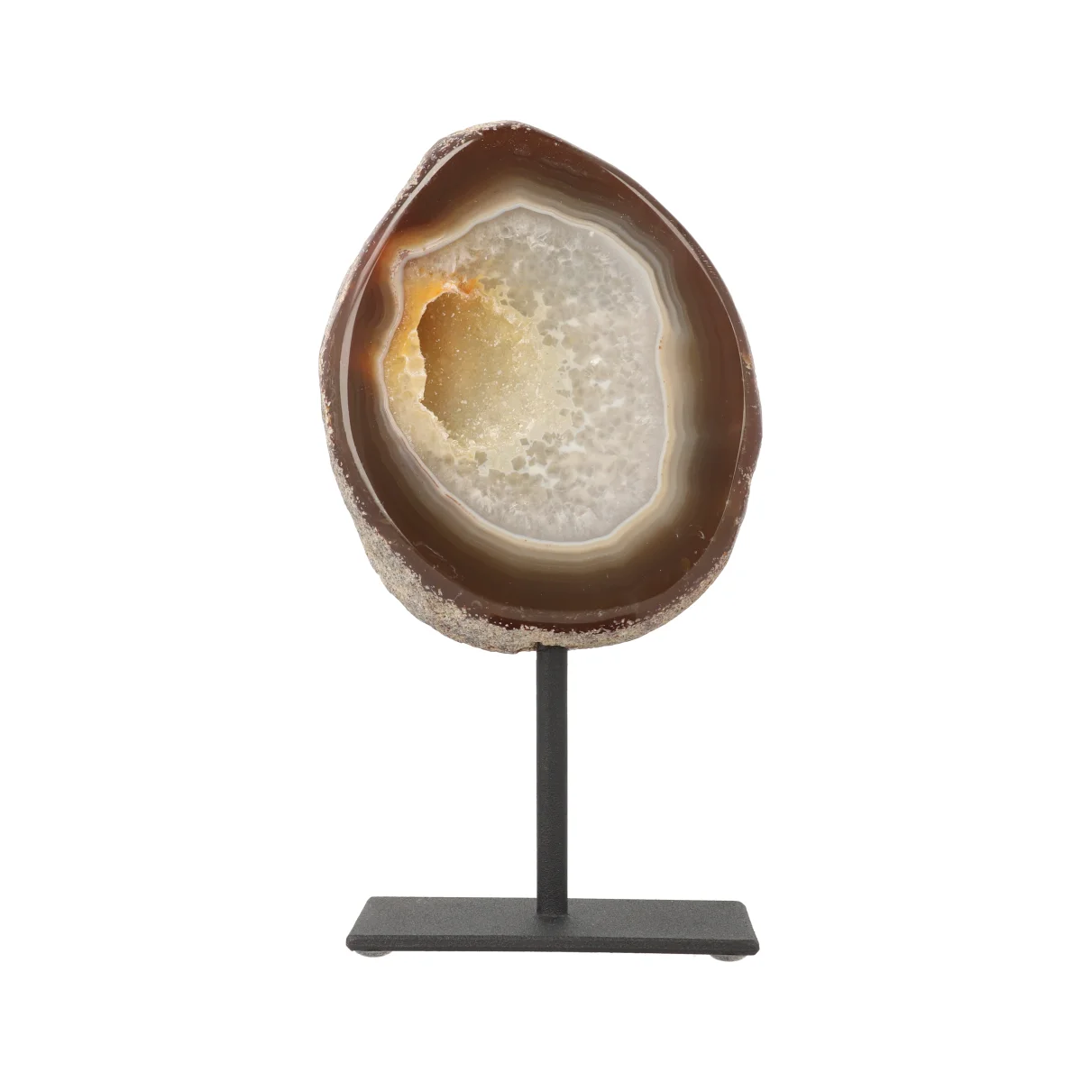 Een Agaat Geode heeft doorgaans een opening met zichtbare kristalvorming. Een Agaat Eind (het eindstuk van een geode) is meestal massief en heeft geen opening, maar kan heel soms lichte kristalvorming bevatten. De Agaat op Standaard is volledig massief en oogt daardoor over het algemeen eentoniger dan een Agaat Eind.
