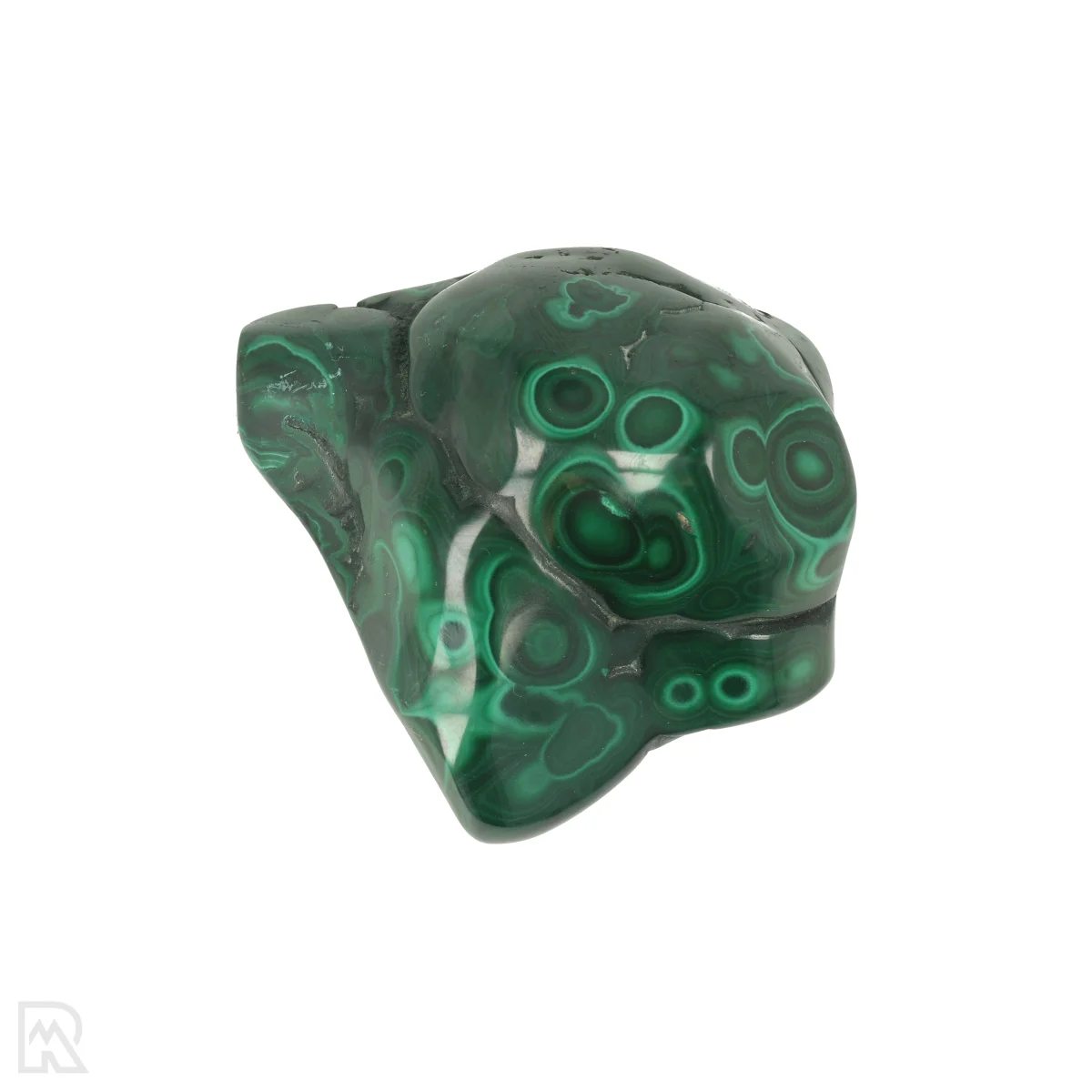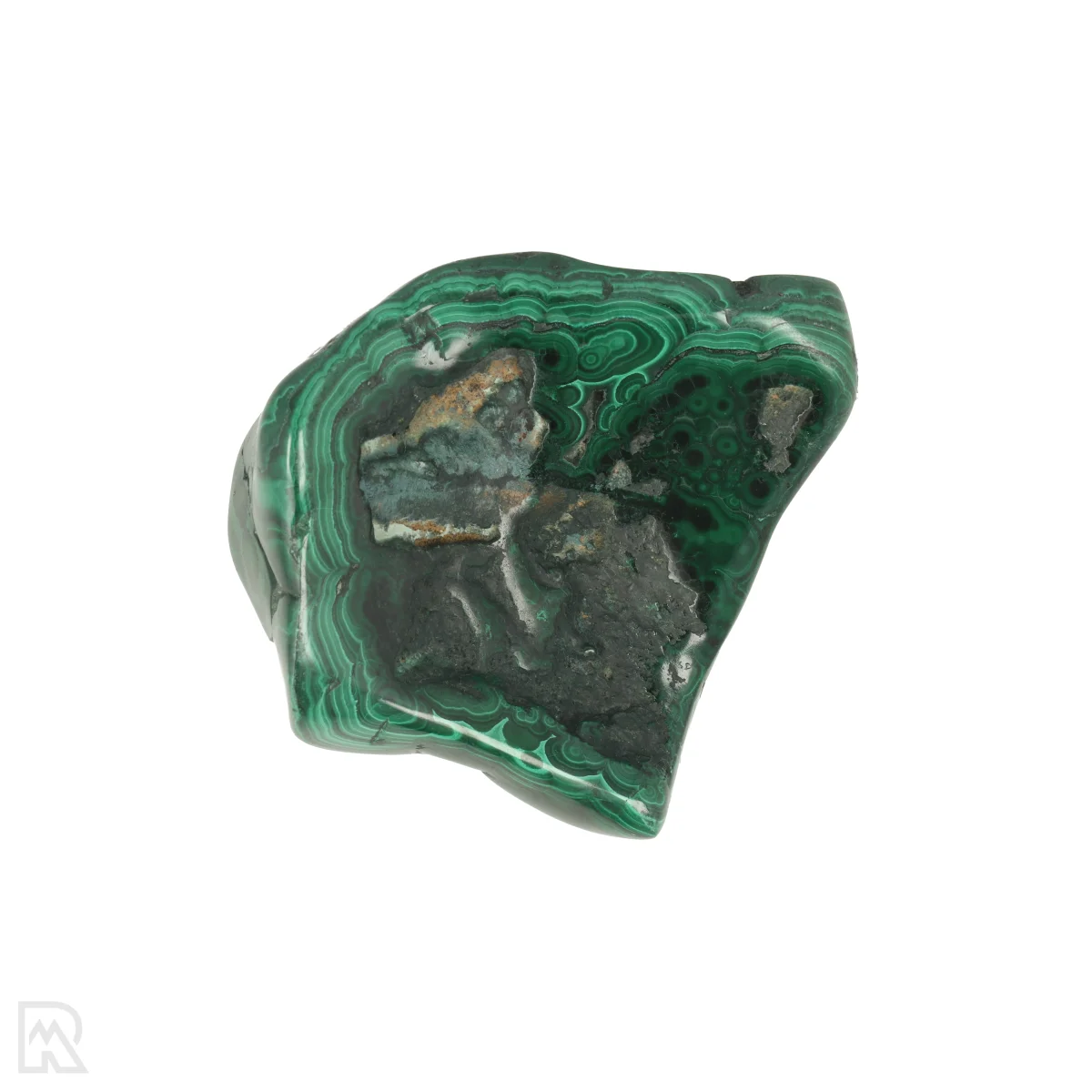 Malachiet is een intens groen koperhoudend mineraal dat opvalt door zijn karakteristieke bandpatronen en glas- tot zijdeachtige glans. De kleur varieert van lichtgroen tot donkergroen, vaak met concentrische of gelaagde tekeningen. Het mineraal vormt zich meestal in de oxidatiezones van koperafzettingen.