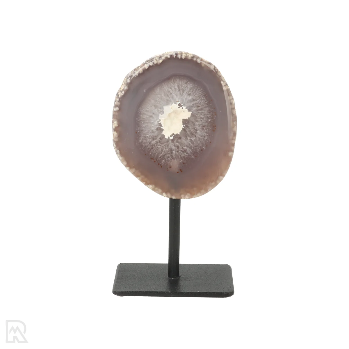 Deze Agaat is doorgezaagd, gepolijst en geplaatst op een zwarte gecoate standaard. Wij hebben drie varianten in ons assortiment: Agaat Geode op Standaard, Agaat Eind op Standaard en Agaat op Standaard.