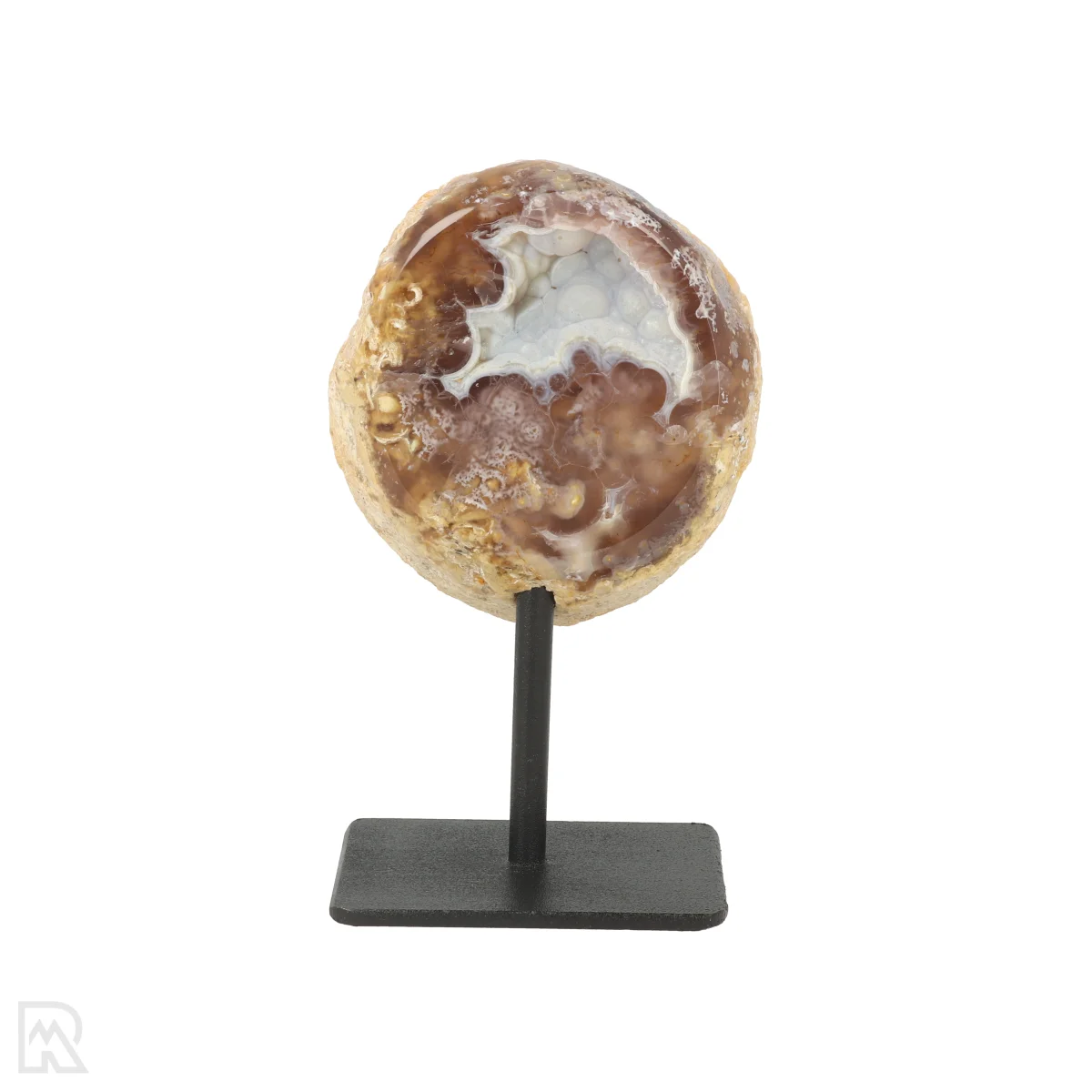Deze Agaat is doorgezaagd, gepolijst en geplaatst op een zwarte gecoate standaard. Wij hebben drie varianten in ons assortiment: Agaat Geode op Standaard, Agaat Eind op Standaard en Agaat op Standaard.
