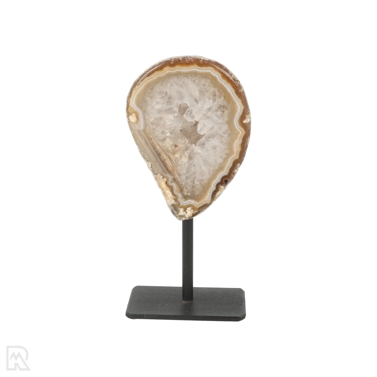 Deze Agaat is doorgezaagd, gepolijst en geplaatst op een zwarte gecoate standaard. Wij hebben drie varianten in ons assortiment: Agaat Geode op Standaard, Agaat Eind op Standaard en Agaat op Standaard.
