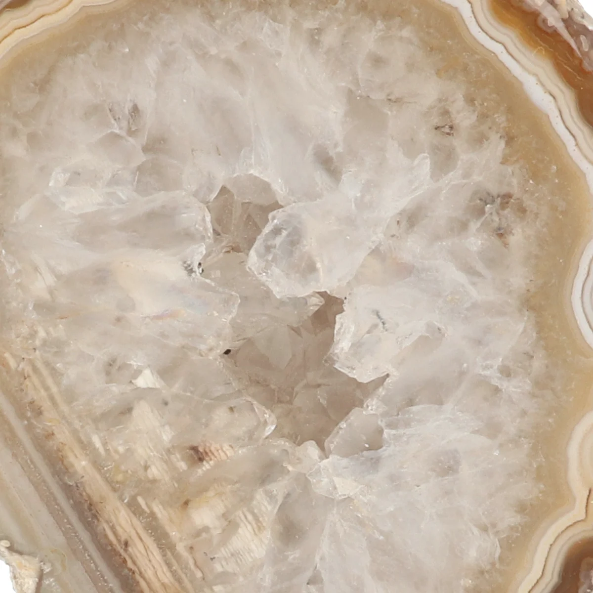 Een Agaat Geode heeft doorgaans een opening met zichtbare kristalvorming. Een Agaat Eind (het eindstuk van een geode) is meestal massief en heeft geen opening, maar kan heel soms lichte kristalvorming bevatten. De Agaat op Standaard is volledig massief en oogt daardoor over het algemeen eentoniger dan een Agaat Eind.