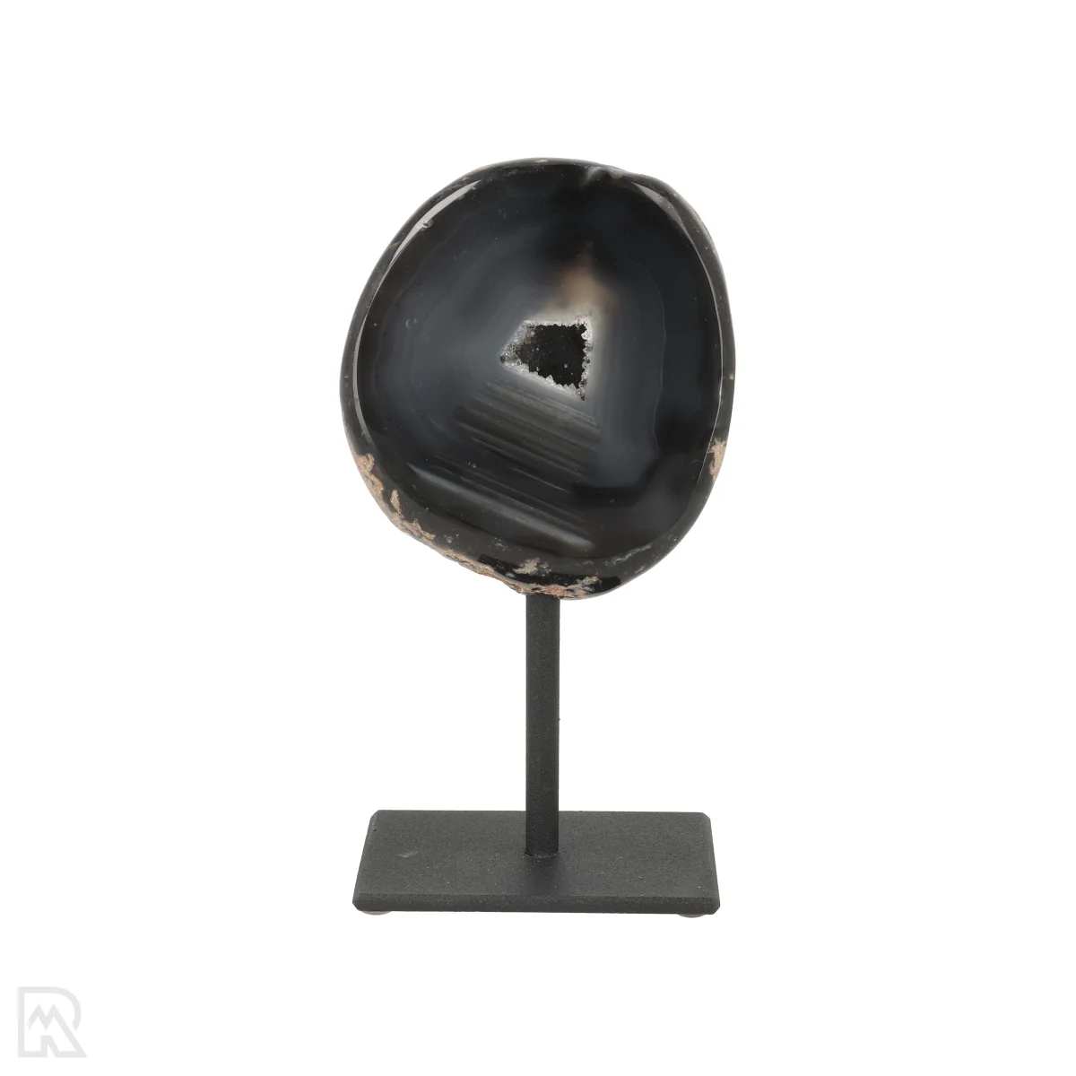 Deze Agaat is doorgezaagd, gepolijst en geplaatst op een zwarte gecoate standaard. Wij hebben drie varianten in ons assortiment: Agaat Geode op Standaard, Agaat Eind op Standaard en Agaat op Standaard.