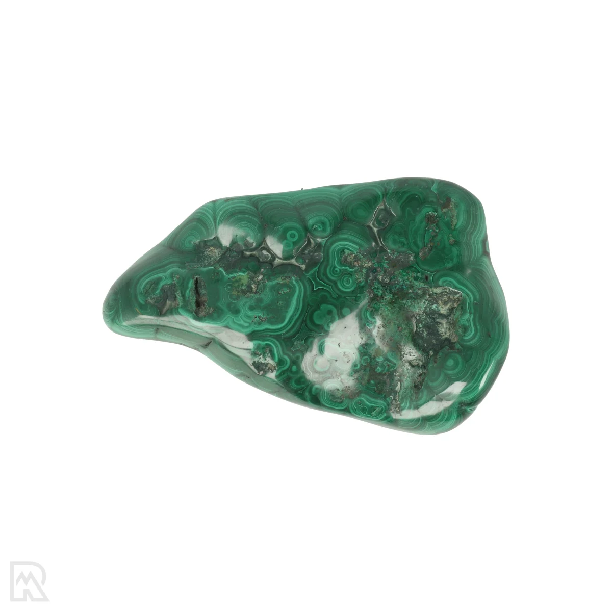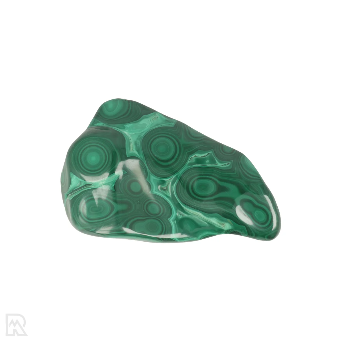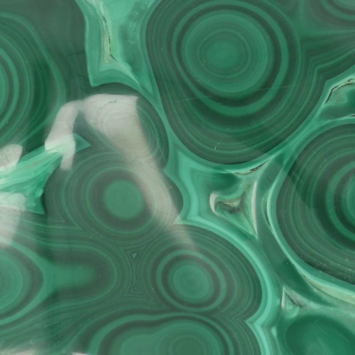 Malachiet is een intens groen koperhoudend mineraal dat opvalt door zijn karakteristieke bandpatronen en glas- tot zijdeachtige glans. De kleur varieert van lichtgroen tot donkergroen, vaak met concentrische of gelaagde tekeningen. Het mineraal vormt zich meestal in de oxidatiezones van koperafzettingen.