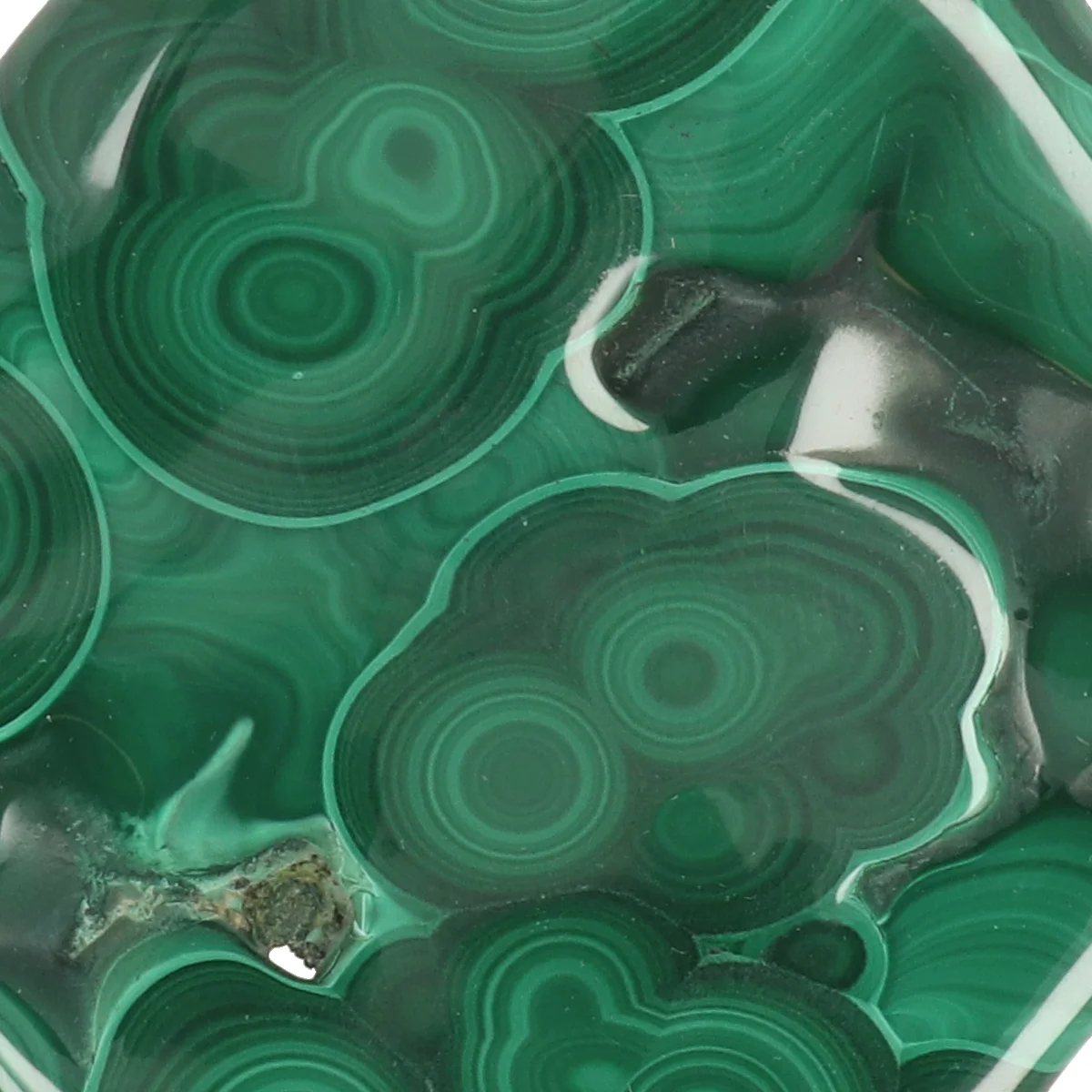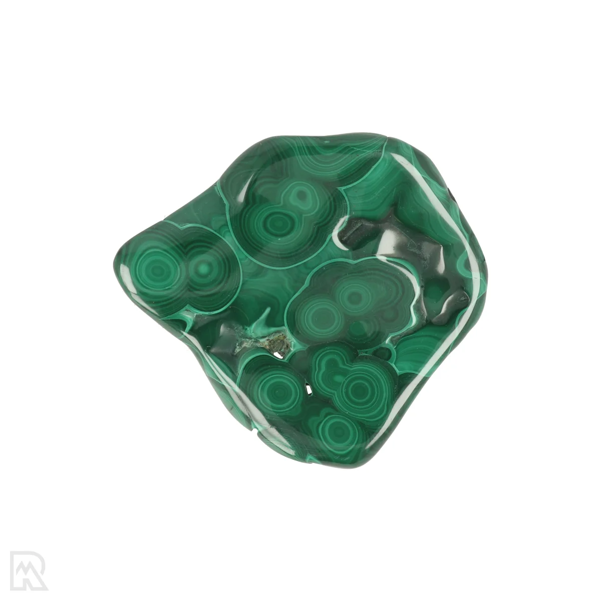Malachiet is een intens groen koperhoudend mineraal dat opvalt door zijn karakteristieke bandpatronen en glas- tot zijdeachtige glans. De kleur varieert van lichtgroen tot donkergroen, vaak met concentrische of gelaagde tekeningen. Het mineraal vormt zich meestal in de oxidatiezones van koperafzettingen.