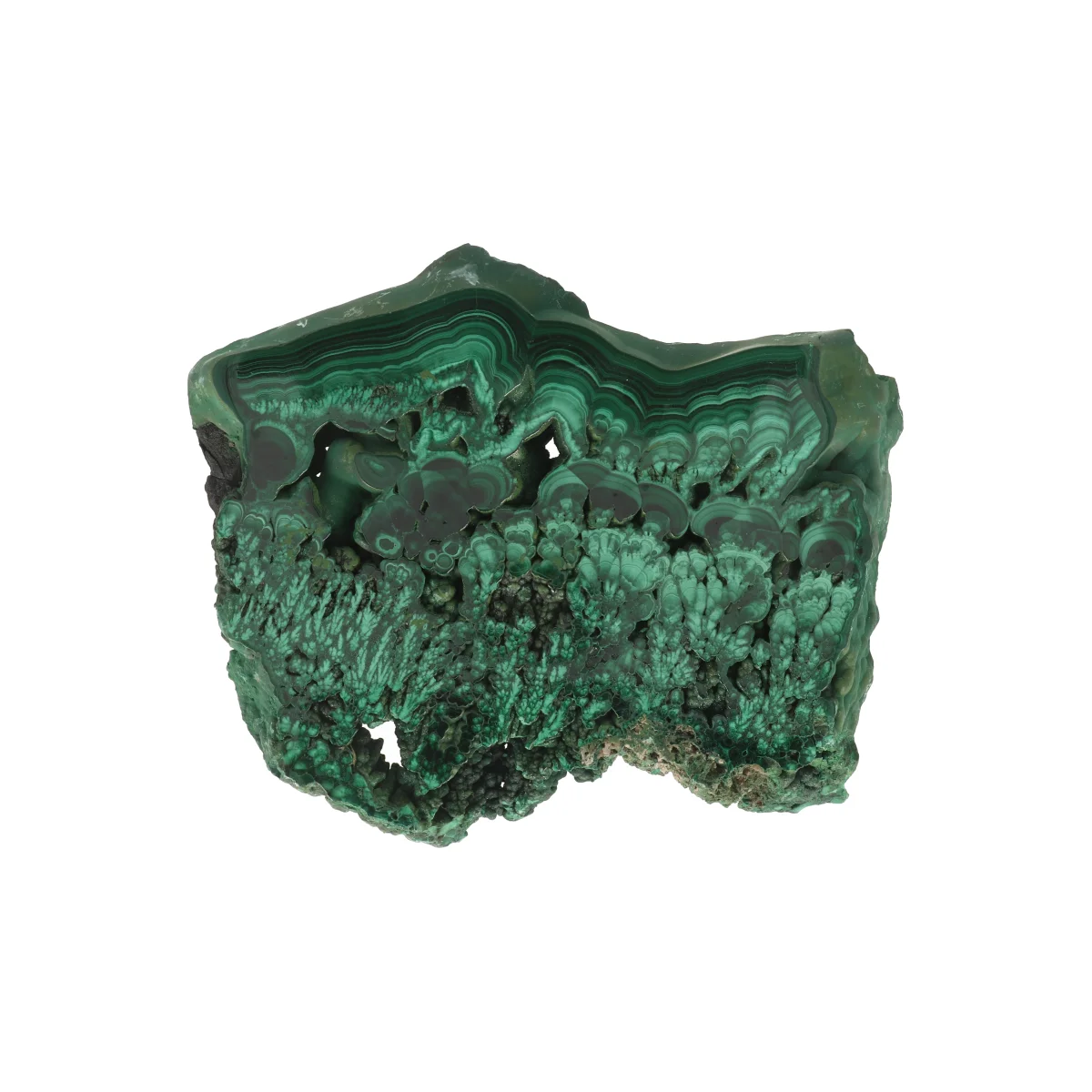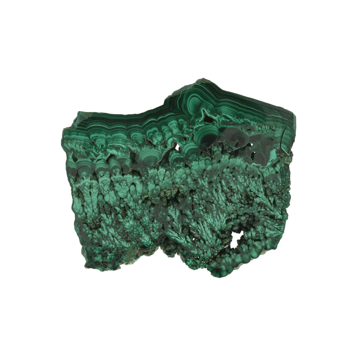 Malachiet is een intens groen koperhoudend mineraal dat opvalt door zijn karakteristieke bandpatronen en glas- tot zijdeachtige glans. De kleur varieert van lichtgroen tot donkergroen, vaak met concentrische of gelaagde tekeningen. Het mineraal vormt zich meestal in de oxidatiezones van koperafzettingen.
