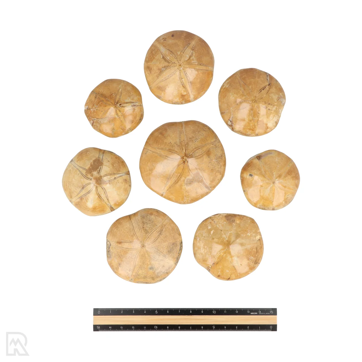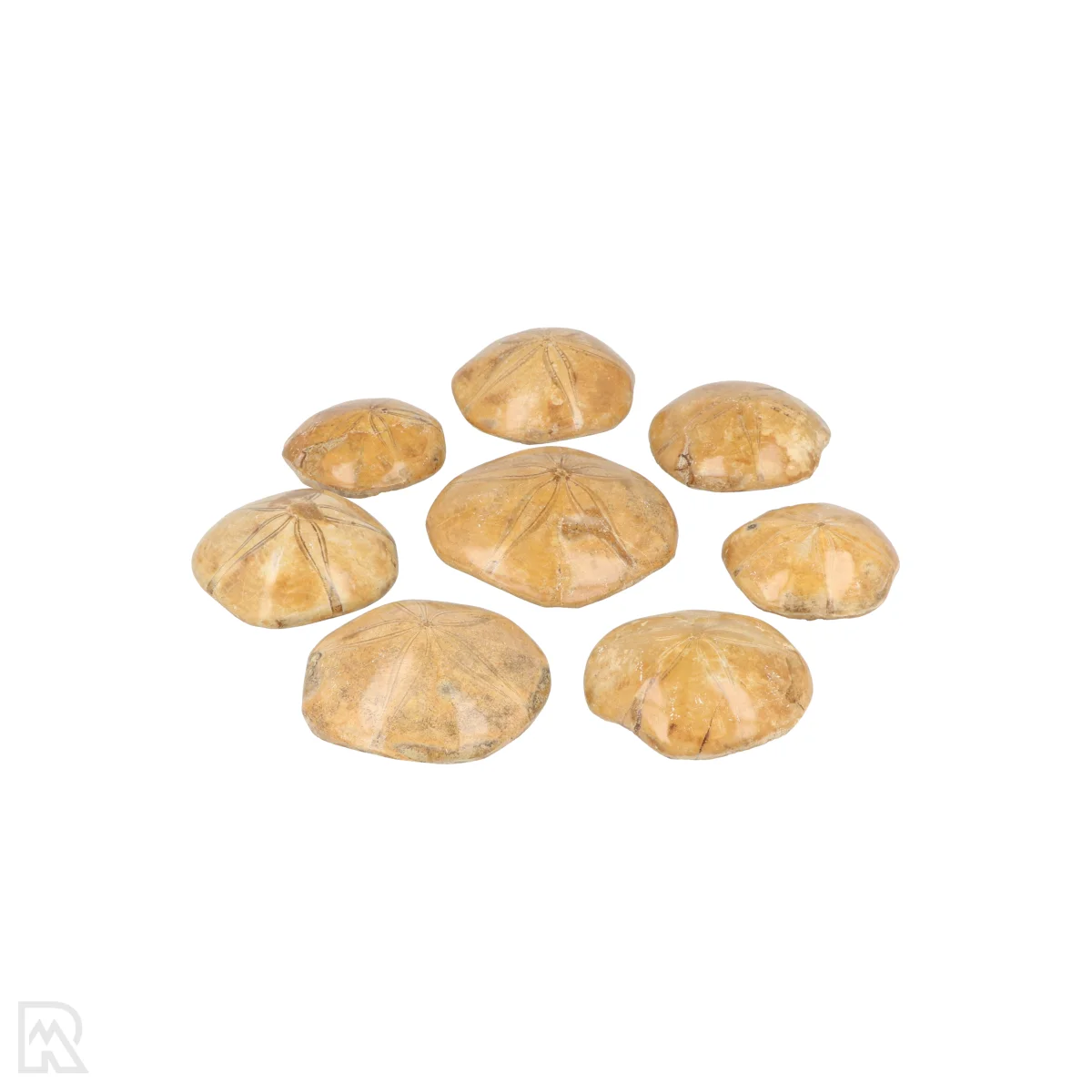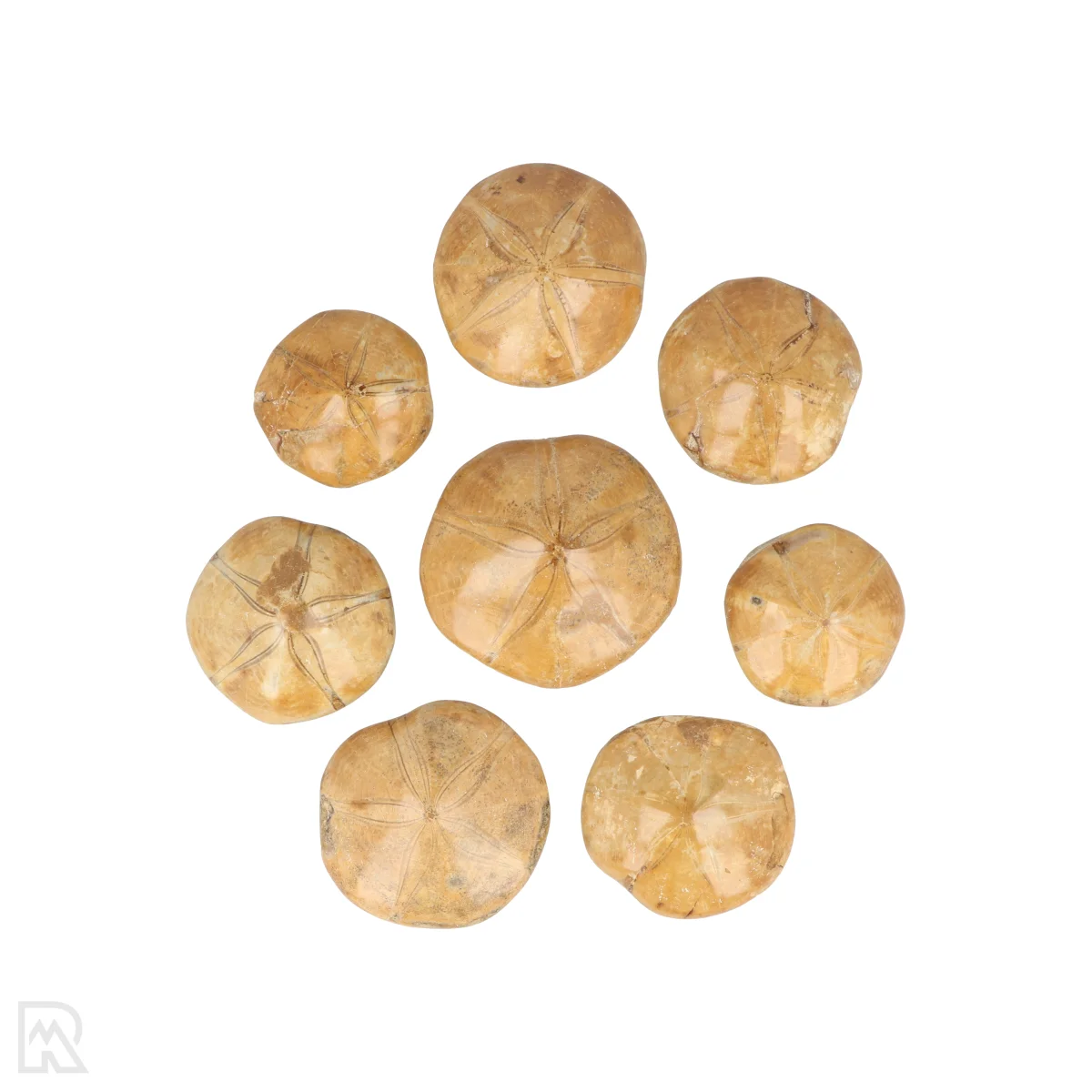 Zanddollars zijn fossielen van zee-egels, herkenbaar aan hun platte, ronde vorm en fijne stertekening. Deze mariene fossielen dateren van circa 160 miljoen jaar oud en geven een goed beeld van het leven in prehistorische zeeën. Door hun vorm en patroon lijken ze sterk op hedendaagse zee-egels en verwante soorten zoals zeesterren. De exemplaren zijn rond van vorm, licht bollig en hebben een gepolijst aanzicht, waardoor de tekening extra goed zichtbaar is.