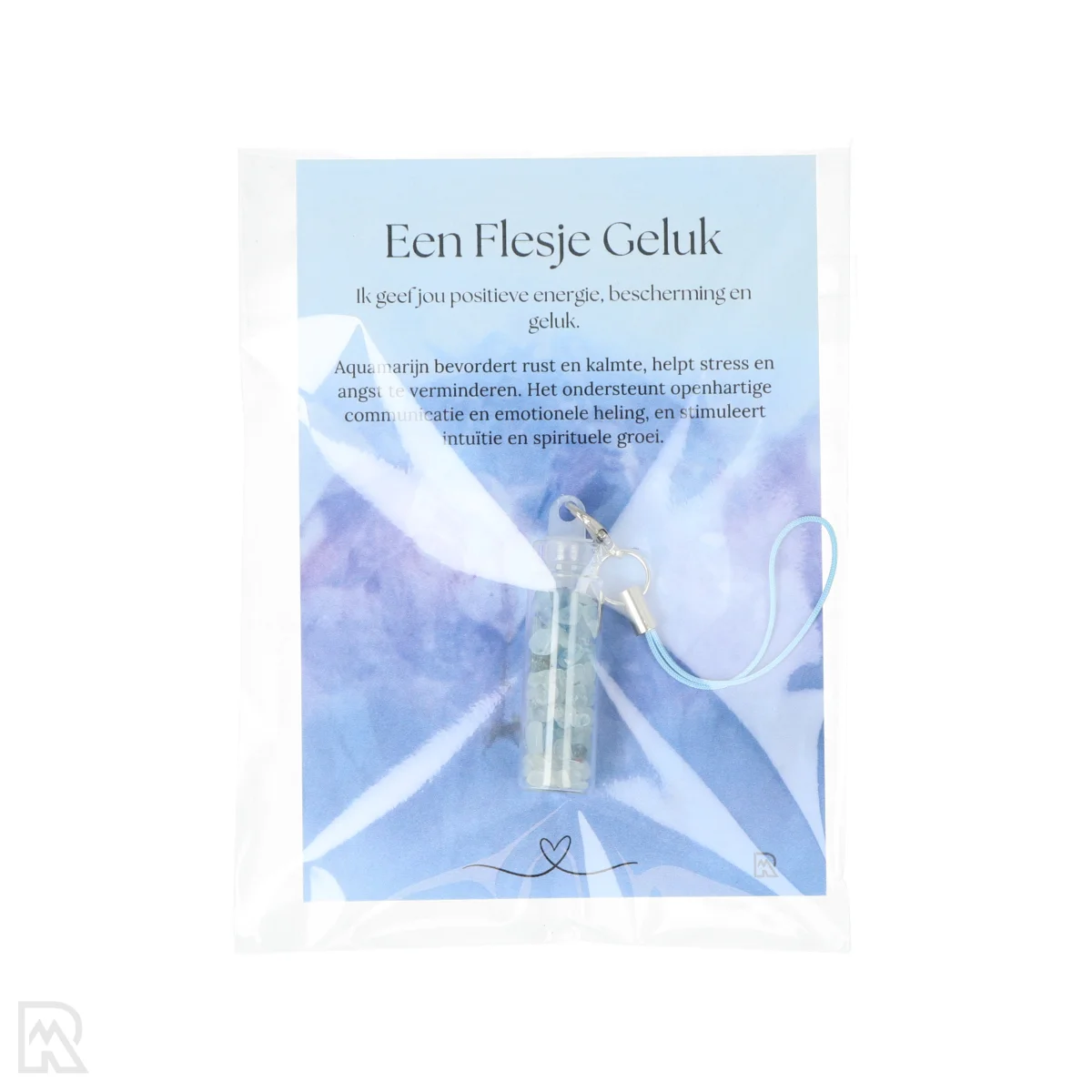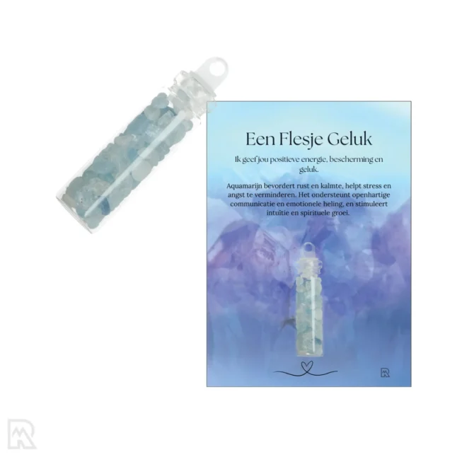 Een kant en klaar verkoopzakje met een flesje Aquamarijn split en korte toelichtende tekst over de energetische eigenschappen van Aquamarijn. Het flesje Aquamarijn is ongeveer 3,5 cm en voorzien van een koortje. Het kaartje is geprint in kleur, a7 formaat en voorzien van zowel Nederlandse als Engelse tekst. Dit alles wordt geleverd in een plastic zakje met plakstrip van circa 9×11 cm.