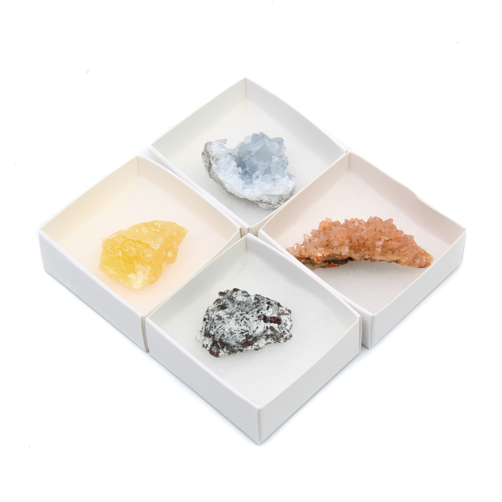 Per doos verschilt de mineraal keuze voor een altijd kleurrijke en prachtige verzameling aan mineralen.