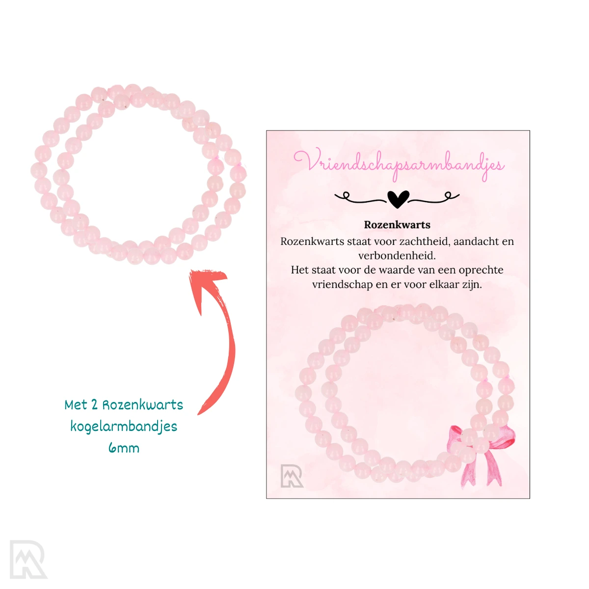 Een kant en klaar verkoopzakje met 2 kogelarmbandjes rozenkwarts van 6 mm en bijpassend kaartje, natuurlijk in de kwaliteit die je van ons gewend bent. Het kaartje is geprint in kleur, a7 formaat. Dit alles wordt geleverd in een cellofaan zakje met plakstrip van circa 9×11 cm.